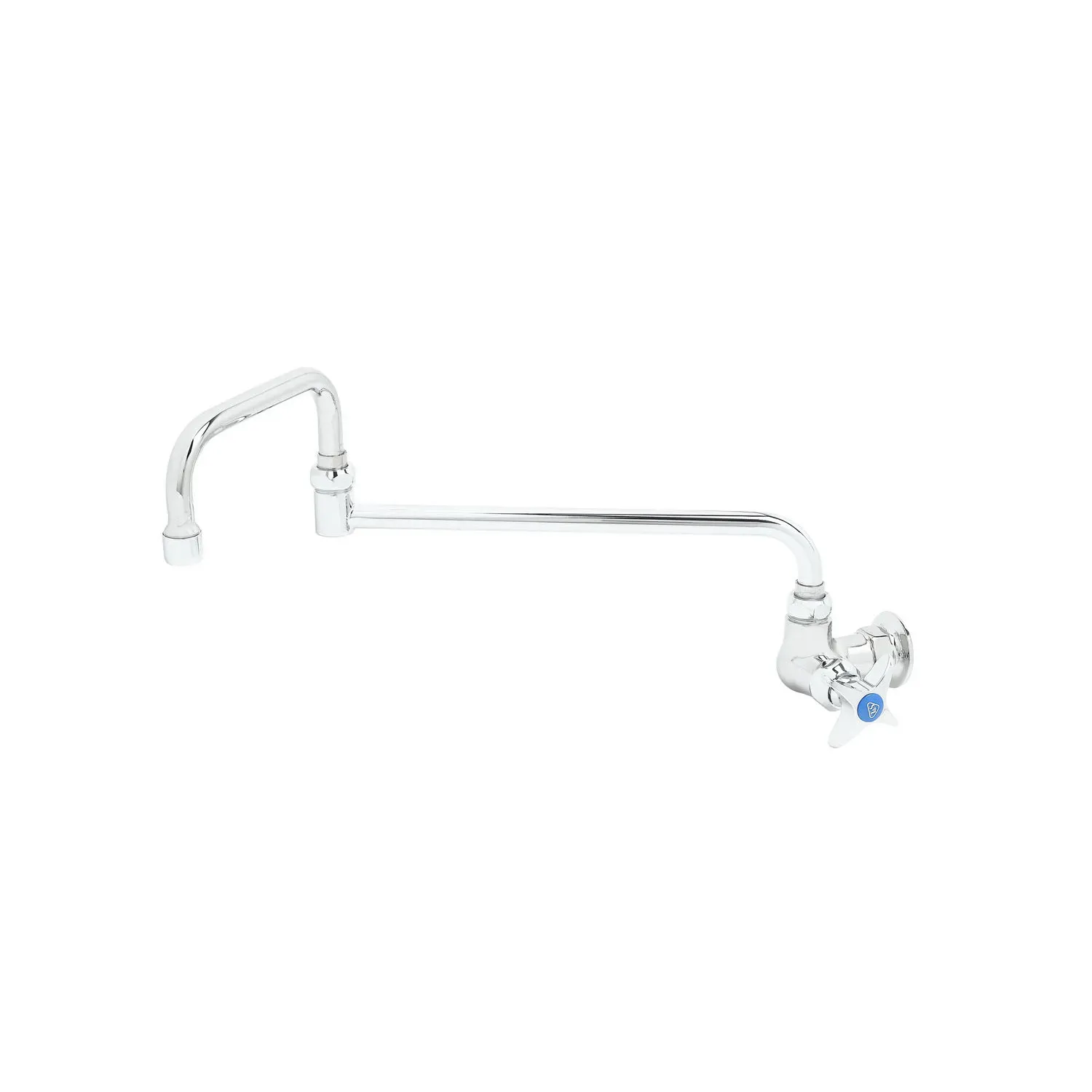 Enhance System Functionality with the T&S Brass B-0260 Faucet, Wall / Splash Mount. This single pantry faucet is designed specifically for commercial restaurant use, offering convenience and durability. The faucet features a single hole base and a wall mount design, making it easy to install and saving valuable counter space. The 18" double joint swing nozzle provides flexibility and precision, allowing for easy filling of pots and pans. With a polished chrome plated brass body, this faucet not only looks sleek but also ensures long-lasting performance. The quarter-turn Eterna compression cartridge with a spring check prevents leaks and drips, reducing water waste. The 4-arm handle with a blue index adds a touch of style while allowing for easy temperature control. Upgrade your restaurant's kitchen with the T&S Brass B-0260 Faucet, Wall / Splash Mount and experience enhanced functionality and efficiency.