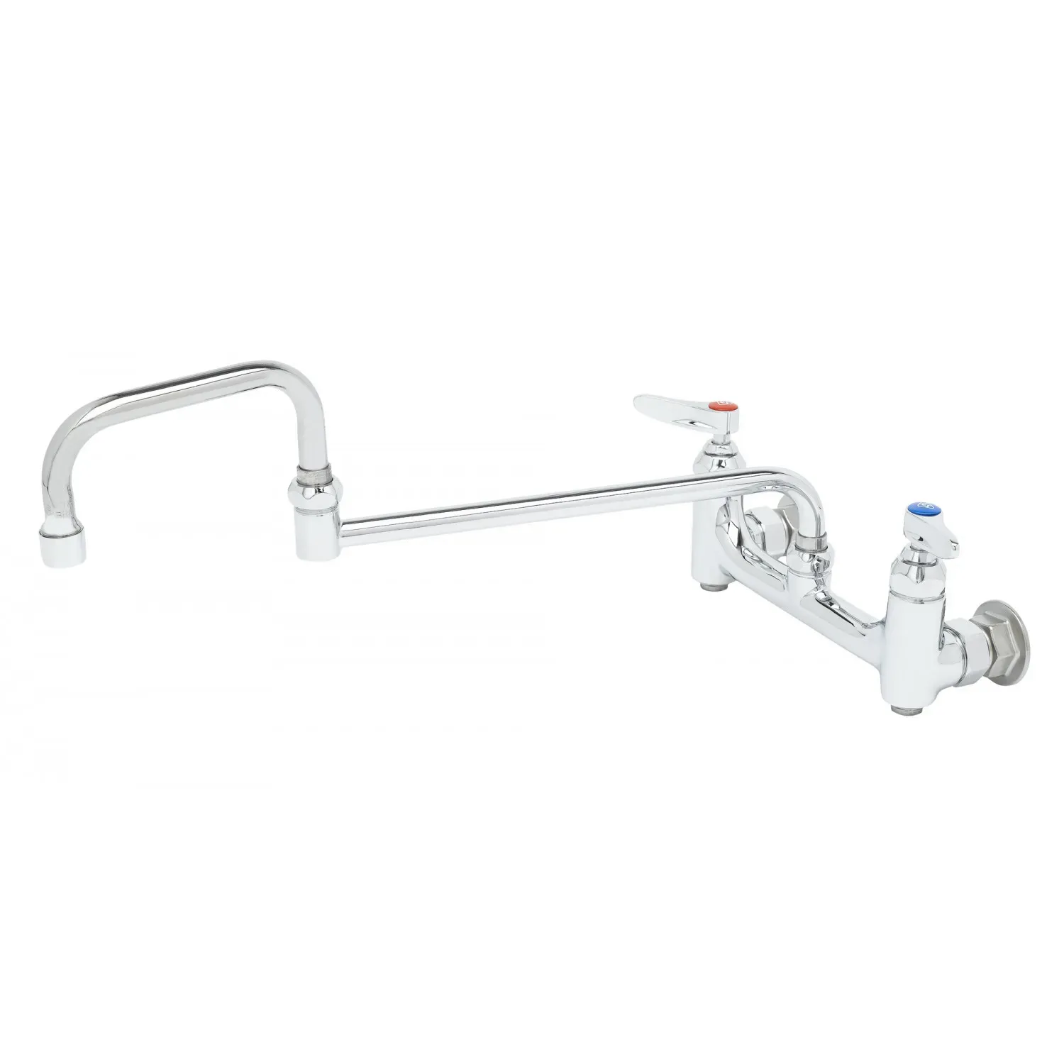 Enhance Equipment Efficiency with the T&S Brass, B-0265-BST, Faucet, Wall / Splash Mount. This double pantry faucet is designed specifically for commercial restaurant use, offering exceptional functionality and durability. With its 8" centers and built-in stop, this wall mount faucet provides convenient and precise control over water flow, allowing for efficient dishwashing and food preparation. The 18" double joint swing nozzle, complete with a 12" back nozzle and 6" front nozzle, ensures maximum flexibility and reach, making it easy to fill large pots and pans or rinse out deep sinks. The polished chrome plated brass body not only adds a sleek and professional look to any kitchen, but also guarantees long-lasting performance. Trust T&S Brass to deliver reliable and high-quality products that will enhance the efficiency of your restaurant equipment.