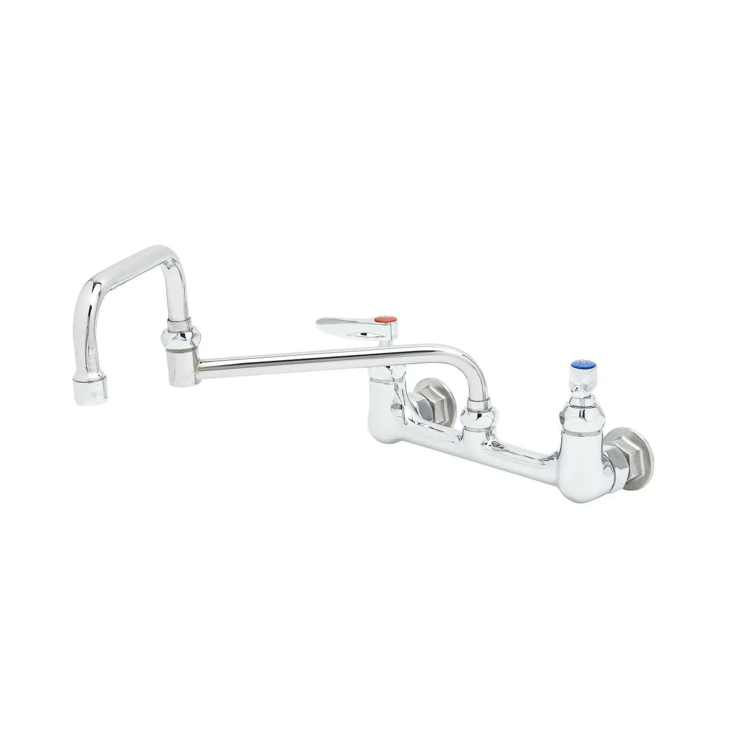 Maintain System Efficiency with the T&S Brass B-0266 Faucet, Wall / Splash Mount. This double pantry faucet is designed to optimize performance in commercial restaurant settings. With its 8" wall mount and polished chrome plated brass body, this faucet is not only durable but also adds a touch of elegance to any kitchen. The 15" double joint swing nozzle, featuring a 9" back nozzle and 6" front nozzle, provides flexibility and ease of use, allowing for precise water flow control. The included lock washer ensures a rigid application, preventing any leaks or drips. Whether you're washing dishes or filling pots, this T&S Brass faucet is the perfect choice for maintaining system efficiency in your restaurant. Trust in the quality and reliability of T&S Brass, a trusted name in the industry. Upgrade your kitchen with the T&S Brass B-0266 Faucet, Wall / Splash Mount.