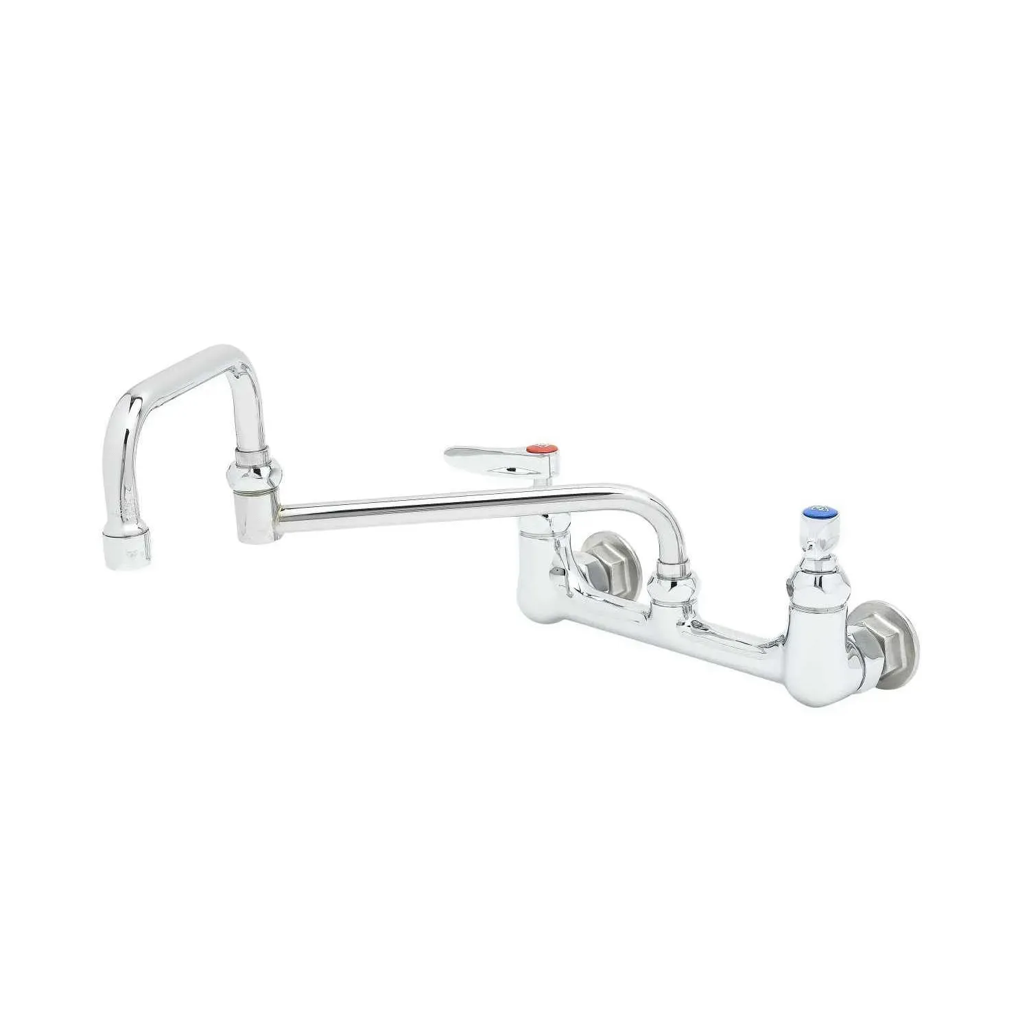 Enhance Equipment Efficiency with the T&S Brass B-0267 Faucet, Wall / Splash Mount. This double pantry faucet is designed specifically for commercial restaurant use, offering exceptional functionality and durability. The 8" wall mount mixing faucet features a polished chrome plated brass body, ensuring long-lasting performance even in high-traffic environments. The 12" double joint swing nozzle with a 6" back nozzle and 6" front nozzle provides flexibility and ease of use, allowing for precise control over water flow and direction. The included lock washer ensures a secure and rigid application, minimizing the risk of leaks or malfunctions. With its reliable construction and user-friendly design, the T&S Brass B-0267 Faucet is an essential addition to any commercial kitchen. Trust in T&S Brass, a reputable vendor known for their quality products. Upgrade your restaurant's equipment today and experience enhanced efficiency and productivity.