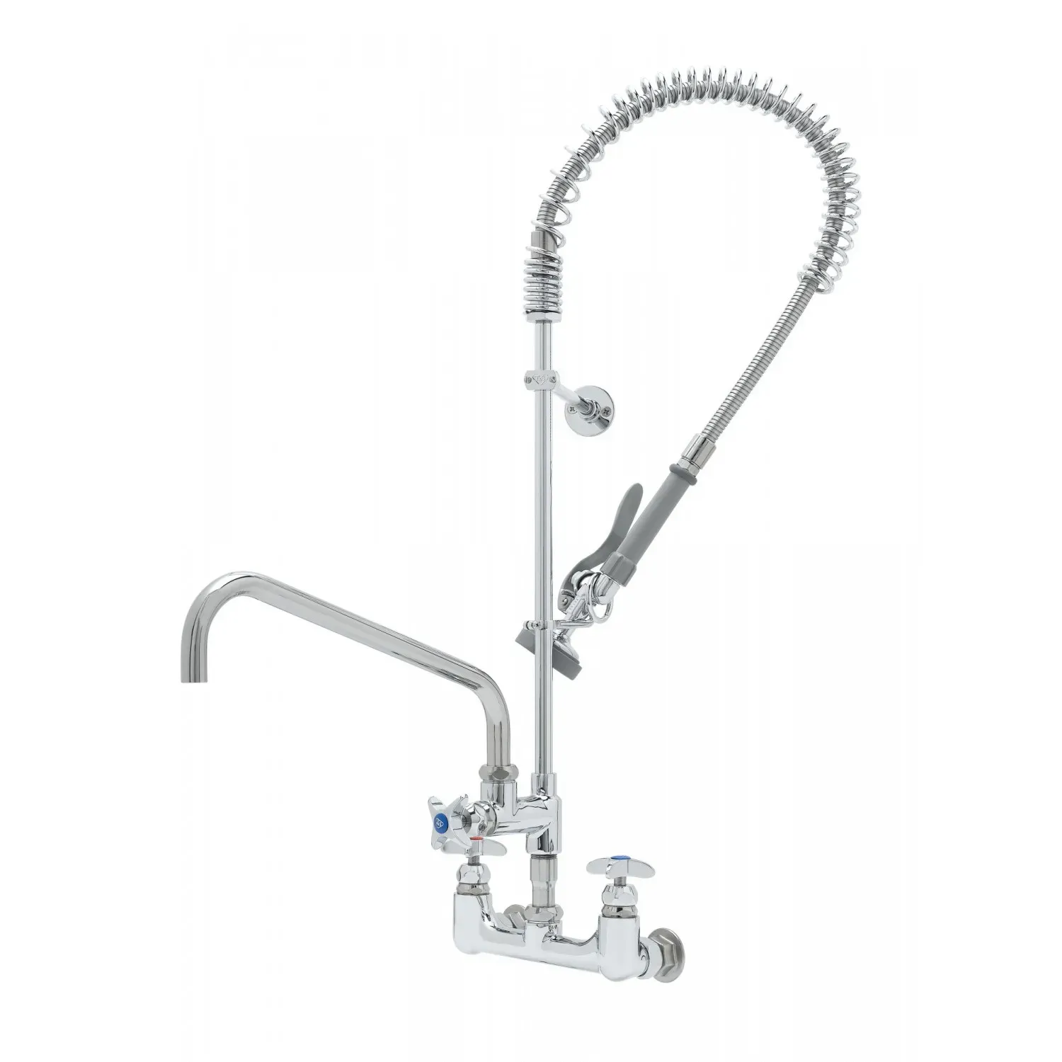 Optimize System Durability with the T&S Brass B-0279 Pre-Rinse Faucet Assembly. Designed specifically for commercial restaurant use, this pre-rinse unit is a must-have for any busy kitchen. The 8" wall mount Big-Flo mixing faucet features a polished chrome plated brass body, ensuring long-lasting durability and resistance to corrosion. The EasyInstall add-on Big-Flo faucet also boasts a polished chrome plated brass body, providing a seamless and reliable addition to your existing setup. With a 14" Big-Flo plain end swing nozzle, you'll have the flexibility and reach needed to efficiently rinse dishes and utensils. The 36" hose and B-0107 spray complete the package, offering convenience and versatility. Upgrade your restaurant's efficiency and reliability with the T&S Brass B-0279 Pre-Rinse Faucet Assembly.