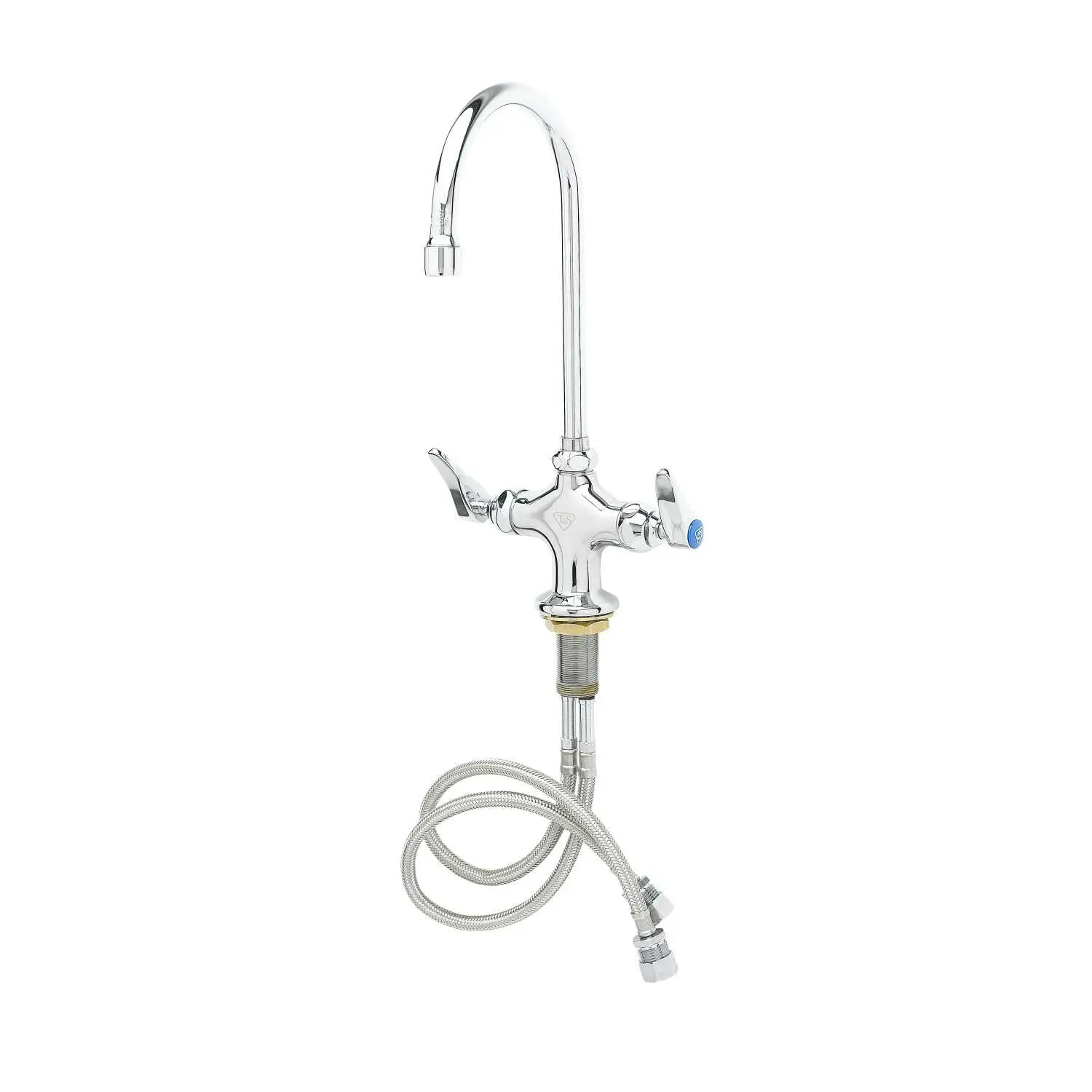 Maintain Equipment Reliability with the T&S Brass B-0300 Pantry Faucet. Designed specifically for commercial restaurant use, this faucet is a must-have for any busy kitchen. With its single hole base and swivel/rigid gooseneck, this faucet offers flexibility and convenience. The polished chrome plated brass body not only adds a touch of elegance to your space but also ensures durability and longevity. The included lock washer allows you to convert the gooseneck to a rigid position when needed. The stream regulator outlet provides a steady and controlled flow of water, perfect for filling pots and pans quickly and efficiently. With its Series 1 designation, you can trust that this faucet meets the highest industry standards for performance and reliability. Trust T&S Brass, a leading vendor in the industry, to deliver a high-quality product that will keep your kitchen running smoothly.