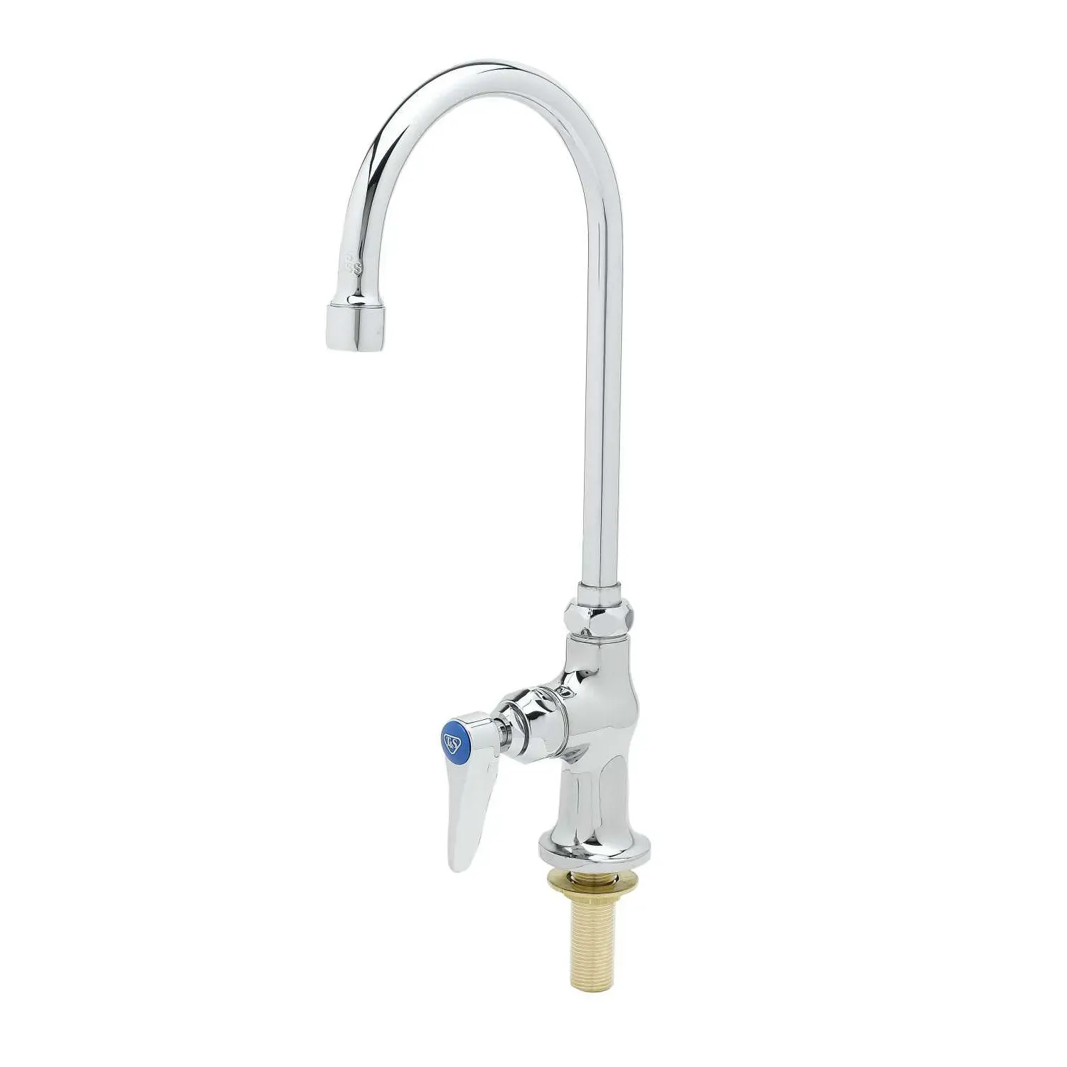 Optimize system operation with the T&S Brass B-0305 Faucet, designed specifically for commercial restaurant use. This single pantry faucet features a deck mount design, ensuring easy installation and a sleek appearance. The swivel/rigid gooseneck allows for flexibility and convenience, while the stream regulator ensures a steady flow of water for efficient dishwashing and food preparation. The polished chrome plated brass body not only adds a touch of elegance to your restaurant's decor but also ensures durability and longevity. With a single hole single temperature deck mount, this faucet is perfect for any pantry setup. The lock washer provided allows for rigid application, ensuring stability during heavy use. Trust T&S Brass, a reputable vendor in the industry, to deliver a high-quality product that meets the demands of your busy commercial kitchen.