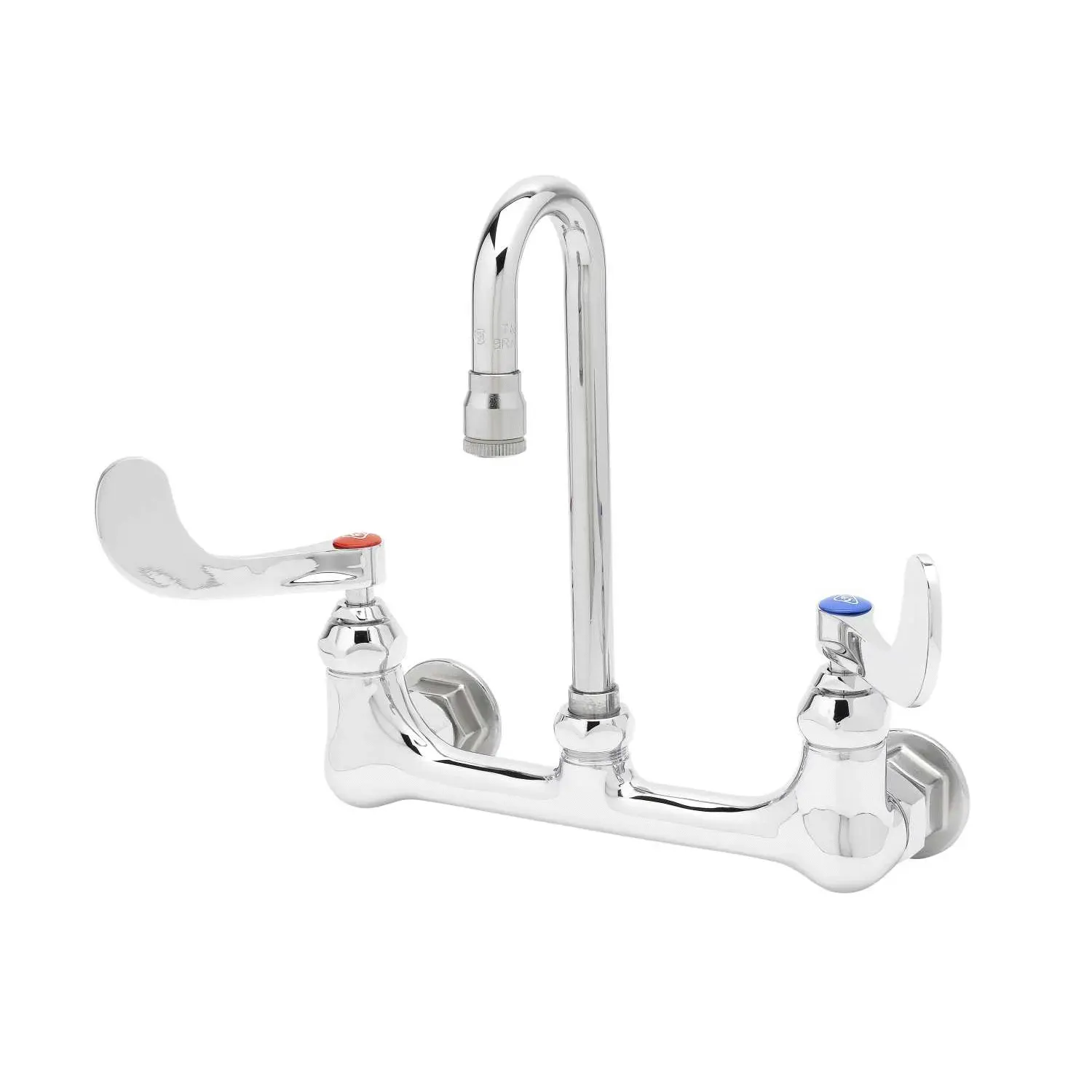 Optimize Equipment Use with the T&S Brass, B-0330-01-WH4 Faucet, Wall / Splash Mount. This double pantry faucet is designed specifically for commercial restaurant use, ensuring efficient and reliable performance. With its 8" centers and swivel gooseneck, this faucet provides flexibility and convenience in any kitchen setup. The 4" wrist-action handles allow for easy control and operation, reducing strain on the user. The polished chrome plated brass body not only adds a sleek and professional look to your restaurant, but also ensures durability and longevity. Whether you need to fill large pots or wash dishes, this faucet is up to the task. It comes with a lock washer for rigid application, providing stability and preventing leaks. Trust T&S Brass to deliver high-quality, restaurant-grade equipment that meets your needs.