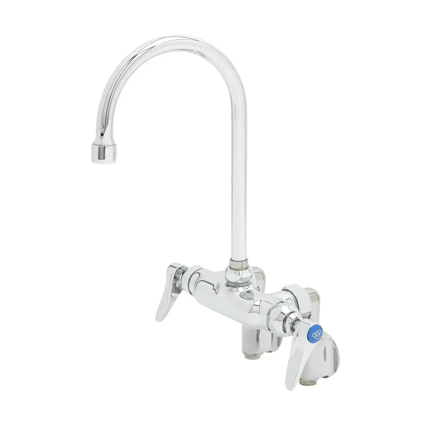 Improve system performance with the T&S Brass B-0343 Manual Faucet. Designed specifically for commercial restaurant use, this double pantry faucet is wall-mounted and features adjustable centers for easy installation. The 5 3/4" swivel and rigid gooseneck allows for flexible positioning, while the integral stops provide added convenience. With a polished chrome plated brass body, this faucet not only looks sleek but is also durable and long-lasting. The compression cartridges with spring checks ensure smooth operation, while the lever handles make it easy to control water flow and temperature. Certified to meet ASME, CSA, NSF, and ADA requirements, this faucet is a reliable choice for any restaurant. Upgrade your kitchen with the T&S Brass B-0343 Manual Faucet and experience improved performance and efficiency.