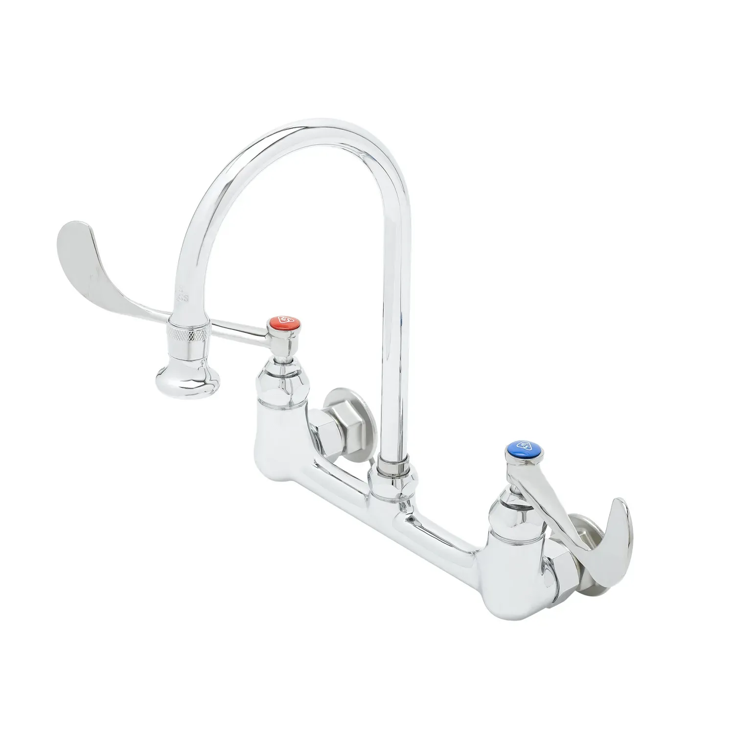 Maintain Operational Safety with T&S Brass, B-0350, Manual Faucets. This wall mount faucet is designed for commercial restaurant use, ensuring the safety and efficiency of your operations. With 8" centers and a polished chrome plated brass body, this faucet is built to withstand the demands of a busy kitchen. The 5 13/16" swivel/rigid gooseneck and 2.2 GPM rosespray outlet provide versatility and precision, allowing you to easily fill pots and pans of various sizes. The compression cartridges with spring checks ensure smooth operation and prevent leaks, while the 6" wrist action handles offer easy control and accessibility. Certified to ASME A112.18.1/CSA B125.1, NSF 61-Section 9, and NSF 372, this faucet meets the highest standards of quality and safety. Additionally, it complies with ADA ANSI/ICC A117.1 requirements, making it accessible to all users. Upgrade your restaurant's kitchen with the T&S Brass B-0350 and experience enhanced safety and efficiency.