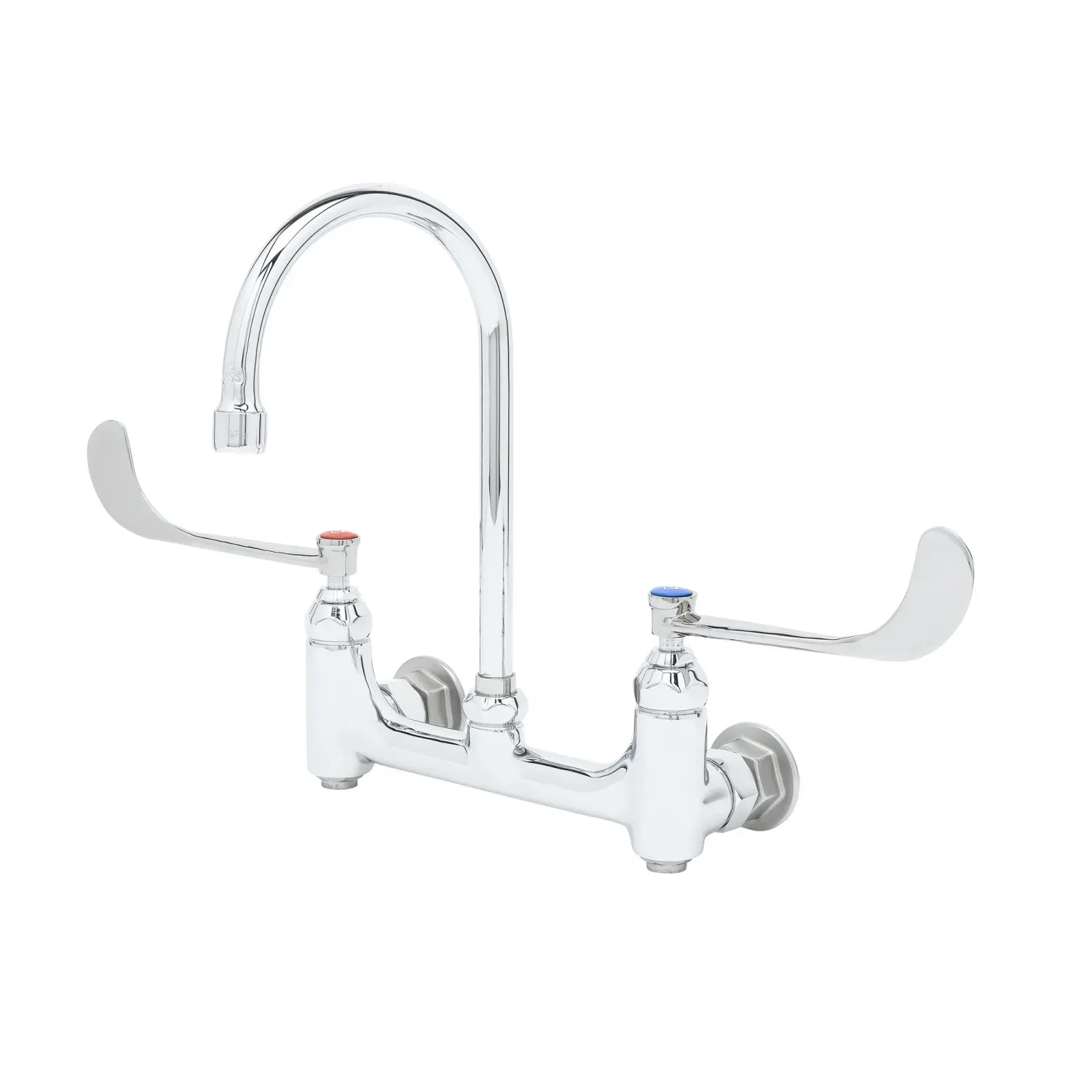 Maintain Equipment Reliability with T&S Brass, B-0353, Manual Faucets. This medical faucet is designed for commercial restaurant use, ensuring durability and functionality. The 8" wall mount mixing faucet features a polished chrome plated brass body, providing a sleek and professional look. With built-in service stops in the body, maintenance and repairs are made easier, minimizing downtime. The 5 3/4" swivel/rigid gooseneck with a stream regulator outlet allows for precise water flow control, perfect for filling pots and pans or rinsing dishes. The compression cartridges with spring checks ensure smooth operation and prevent leaks. The 6" wrist action handles provide easy and convenient control, ideal for busy kitchen environments. Certified to ASME A112.18.1/CSA B125.1, NSF 61-Section 9, and NSF 372, this faucet meets industry standards for safety and quality. Upgrade your restaurant's equipment with the reliable and efficient T&S Brass, B-0353, Manual Faucets.