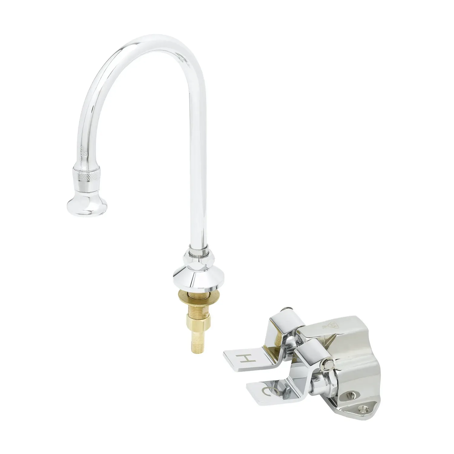 Facilitate Equipment Use with T&S Brass, B-0502-03, Manual Faucets. This double pedal valve is designed specifically for commercial restaurant use, providing convenience and efficiency in a busy kitchen environment. The floor mount design ensures stability and durability, while the 1/2" NPT inlets allow for easy installation. The rigid/swivel gooseneck with rosespray provides versatility, allowing for precise control and direction of water flow. Made with a polished chrome plated brass body and gooseneck, this faucet is not only functional but also aesthetically pleasing. The 2.2 GPM rosespray outlet ensures a steady and powerful water flow, perfect for rinsing dishes and cleaning surfaces. Certified to ASME A112.18.1/CSA B125.1, NSF 61-Section 9, and NSF 372, this faucet meets the highest standards of quality and safety. Upgrade your restaurant's kitchen with the T&S Brass B-0502-03 Manual Faucet.