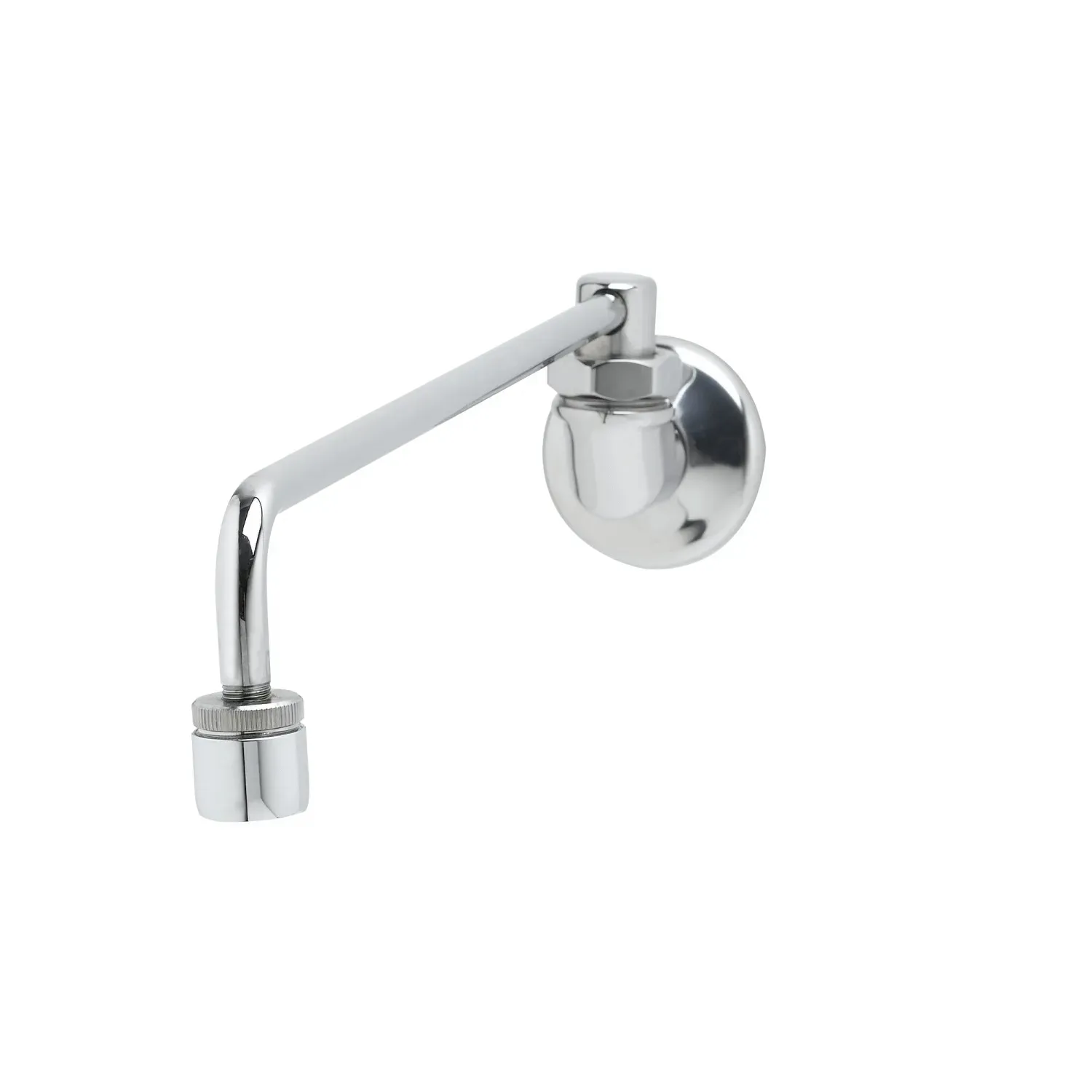 Enhance System Durability with the T&S Brass B-0577-09 Faucet, Wall / Splash Mount. This range faucet is designed specifically for commercial restaurant use, ensuring long-lasting performance and reliability. The back-mounted design with a swing nozzle allows for easy maneuverability and precise control of water flow. The on-off control is actuated when the nozzle swings to the right or left, providing convenience and efficiency in busy kitchen environments. With a 2.2 GPM aerator, this faucet delivers a steady and powerful stream of water, perfect for rinsing dishes, filling pots, and cleaning surfaces. The 8-7/8" nozzle length provides ample reach, making it easy to access hard-to-reach areas. Built by T&S Brass, a trusted name in the industry, this wall/splash mount faucet is a must-have for any commercial restaurant looking to enhance their system durability and efficiency.