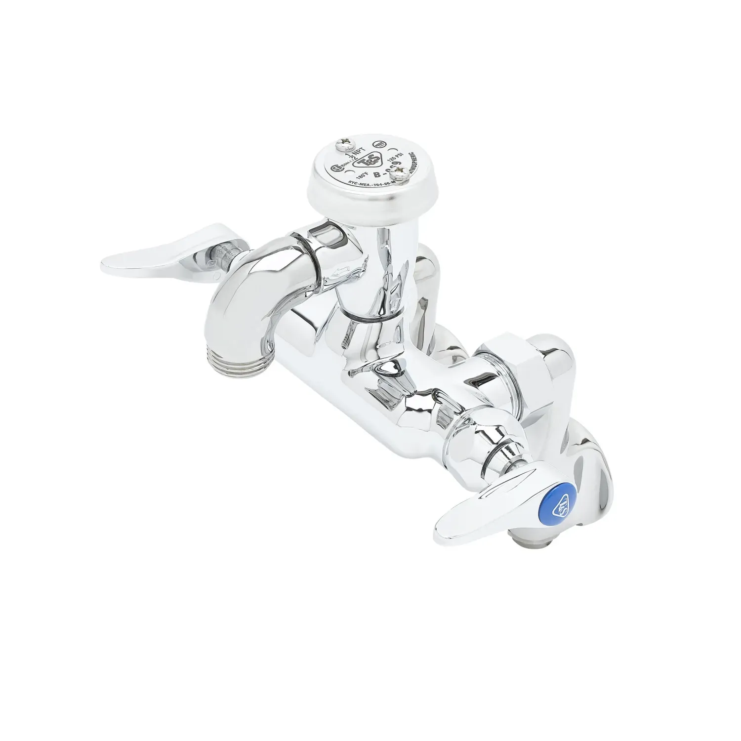 Facilitate Smooth Operation with T&S Brass, B-0669-POL, Manual Faucets. This service sink faucet is designed specifically for commercial restaurant use, ensuring smooth and efficient operation in any busy kitchen. The wall mount feature allows for easy installation and saves valuable counter space. With an adjustable center and integral stop, this faucet offers flexibility and control over water flow. The polished chrome plated brass body and spout not only provide a sleek and professional look but also ensure durability and longevity. The vacuum breaker prevents backflow contamination, meeting the highest safety standards. Equipped with lever handles and compression cartridges with spring checks, this faucet offers easy and precise control over water temperature and pressure. Certified to ASME, CSA, NSF, and ASSE standards, this faucet guarantees reliability and compliance with industry regulations. Upgrade your restaurant's functionality and style with T&S Brass, B-0669-POL, Manual Faucets.