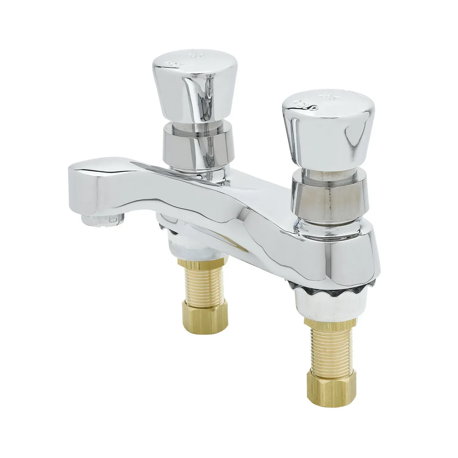 Ensure Reliable Functionality with the T&S Brass B-0831-F05 Manual Faucet. Designed specifically for commercial restaurant use, this deck mount faucet is perfect for any busy kitchen. With a polished chrome plated brass body and integral spout, it not only looks sleek but also ensures durability and longevity. The 4" centers provide easy installation, while the 0.5 GPM non-aerated spray device allows for efficient water flow without splashing. The metering cartridges and push button handles offer precise control and reduce water waste. Certified to ASME A112.18.1/CSA B125.1, NSF 61-Section 9, and NSF 372, this faucet meets all industry standards for safety and quality. It also complies with ADA ANSI/ICC A117.1 requirements, making it accessible for all users. Trust T&S Brass, a reputable vendor known for their reliable and high-quality products. Upgrade your restaurant's functionality with the T&S Brass B-0831-F05 Manual Faucet.