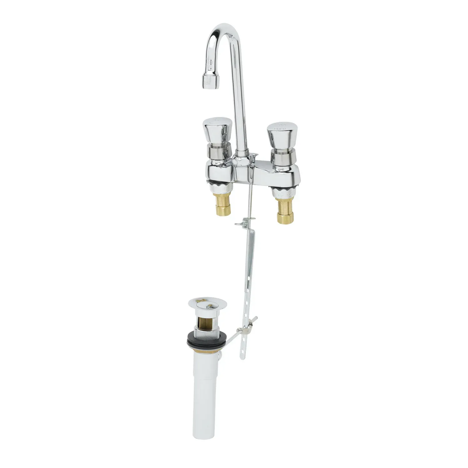 Maintain Equipment Functionality with the T&S Brass B-0833 Manual Faucet. Designed specifically for commercial restaurant use, this deck mount faucet ensures reliable performance and durability. The 4" centerset mixing faucet features a swivel/rigid gooseneck, allowing for easy maneuverability and precise water control. The push button handles provide convenient operation, while the metering cartridges ensure water conservation and reduce waste. With a polished chrome plated brass body, this faucet not only adds a sleek and professional look to your establishment but also meets ADA requirements for accessibility. The 2.2 GPM aerator delivers a steady flow of water, perfect for filling pots and pans or rinsing dishes. Certified to ASME A112.18.1/CSA B125.1, NSF 61-Section 9, and NSF 372, this T&S Brass faucet guarantees safety and quality. Upgrade your restaurant's equipment with the B-0833 Manual Faucet and experience enhanced functionality and efficiency.