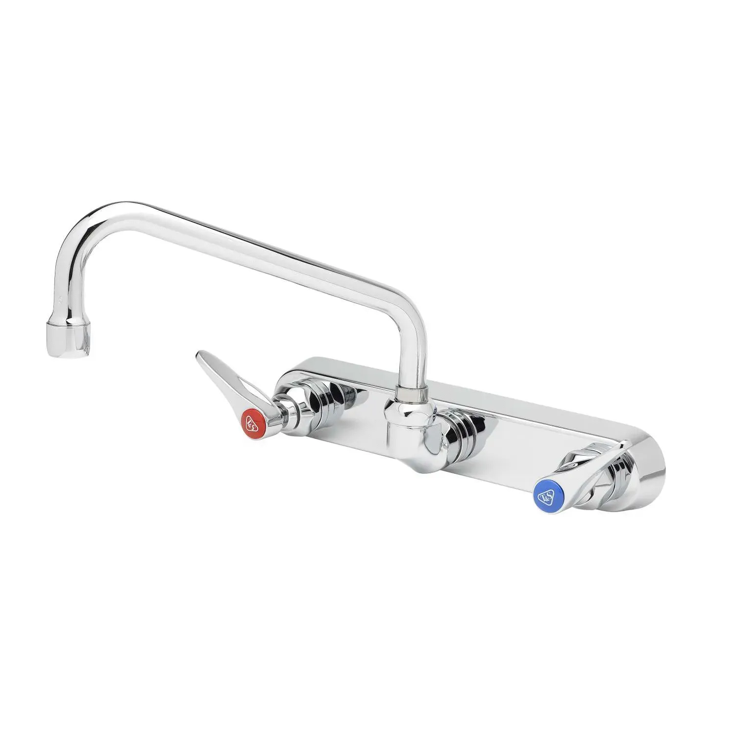 Upgrade System Quality with T&S Brass, B-1126, Manual Faucets. This wall-mounted workboard faucet is designed for commercial restaurant use, offering durability and functionality. With its 8" centers and 8" swing nozzle, this faucet provides easy access to water for various tasks in the kitchen. The lever handles allow for precise control of water flow and temperature, ensuring efficient operation. The chrome-plated brass body and compression cartridges with spring checks guarantee long-lasting performance, even in high-demand environments. Certified to ASME A112.18.1/CSA B125.1, NSF 61-Section 9, and NSF 372, this faucet meets industry standards for safety and quality. It also complies with ADA ANSI/ICC A117.1 requirements, making it accessible for all users. Upgrade your restaurant's system with the T&S Brass B-1126 and enjoy reliable performance and enhanced efficiency in your kitchen.