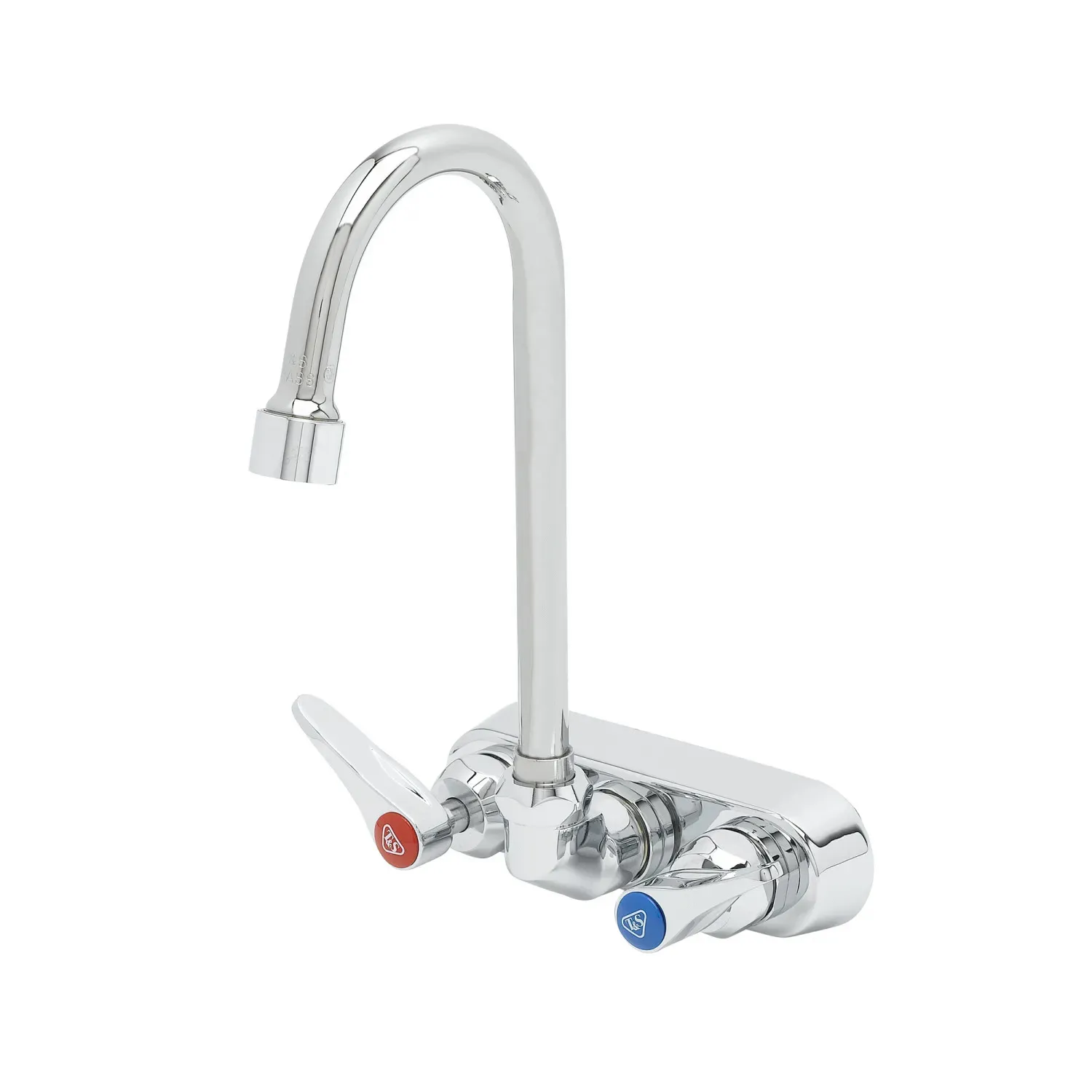 Maintain System Integrity with T&S Brass, B-1146-2-V12-CR, Manual Faucets. This workboard faucet is designed specifically for commercial restaurant use, ensuring durability and reliability in high-demand environments. The 4" wall mount mixing faucet features a chrome plated brass body, providing both strength and a sleek appearance. The 4 3/8" swivel/rigid gooseneck with a 1.2 GPM vandal resistant aerator allows for easy maneuverability and efficient water flow. The ceramic cartridges with check valves ensure smooth operation and prevent leaks, while the lever handles offer precise control over water temperature and flow. Certified to ASME A112.18.1/CSA B125.1, NSF 61-Section 9, and NSF 372, this faucet meets industry standards for safety and quality. Additionally, it meets ADA ANSI/ICC A117.1 requirements, making it accessible for all users. Upgrade your restaurant's plumbing system with the T&S Brass B-1146-2-V12-CR workboard faucet and experience enhanced performance and longevity.
