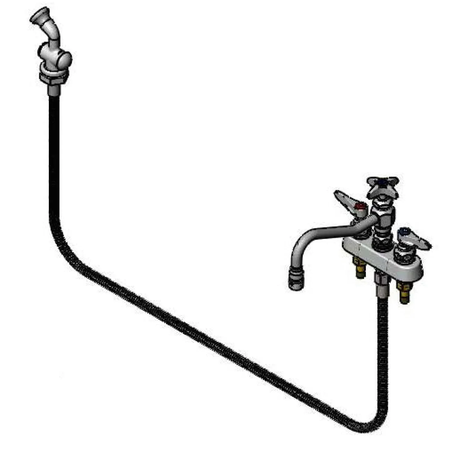 Ensure Efficient Functionality with the T&S Brass B-1151 Manual Faucet. Designed specifically for commercial restaurant use, this deck mount faucet offers reliable performance and convenience. With a 4" center and an 8" swing nozzle with a diverter, this faucet provides easy access to water for various tasks. The chrome plated brass body ensures durability and longevity, while the swivel/rigid diverter valve with a 7 7/8" nozzle and 2.2 GPM aerator outlet allows for versatile use. The compression cartridges with spring checks and lever handles offer smooth operation and precise control. Certified to ASME A112.18.1/CSA B125.1, NSF 61-Section 9, and NSF 372, this faucet meets the highest standards of quality and safety. Complete with a self-closing spray valve, a 48" flexible stainless steel hose, and a deck flange hose guide, the T&S Brass B-1151 Manual Faucet is the perfect choice for any commercial restaurant seeking efficient functionality and reliable performance.