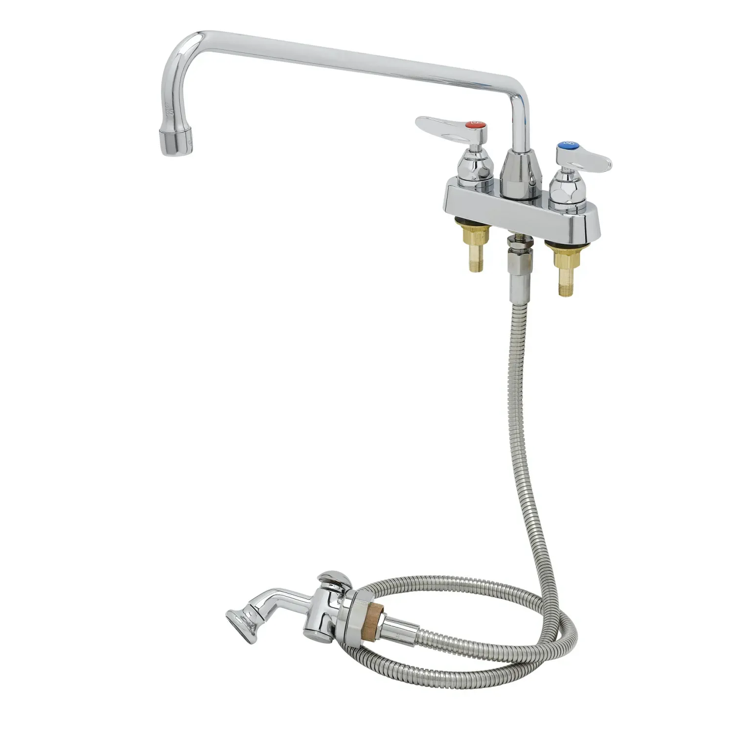 Facilitate Effective Maintenance with the T&S Brass B-1171-01 Manual Faucet. This deck mount faucet is designed specifically for commercial restaurant use, with a 4" centers configuration that ensures easy installation on workboards. The 16" swing nozzle provides ample reach and flexibility, allowing for efficient cleaning and rinsing of dishes and utensils. The faucet also features a diverter and hose, as well as a convenient side spray for added versatility. With its chrome plated brass body and lever handles, this faucet not only offers durability but also a sleek and professional appearance. The compression cartridges with spring checks ensure smooth operation and prevent leaks, while the 1/2" NPT male inlets and chrome plated escutcheon provide a secure and stylish fit. Certified to ASME A112.18.1/CSA B125.1, NSF 61-Section 9, and NSF 372, this T&S Brass faucet guarantees reliability and compliance with industry standards. Upgrade your restaurant's kitchen with the T&S Brass B-1171-01 Manual Faucet and experience enhanced functionality and ease of maintenance.