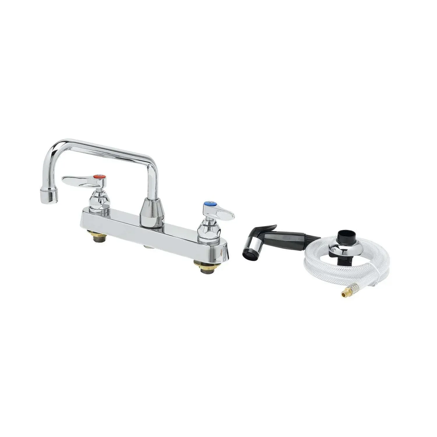 Upgrade Operational Reliability with the T&S Brass B-1172 Manual Faucet. Designed specifically for commercial restaurant use, this deck mount faucet is a reliable and efficient choice for any kitchen. With 8" centers and an 8" swing nozzle, this faucet provides ample reach and flexibility for all your washing and rinsing needs. The included diverter, hose, and side spray add even more versatility, allowing you to easily switch between different tasks. The chrome plated brass body ensures durability and longevity, while the compression cartridges with spring checks provide smooth operation and prevent leaks. Certified to meet ASME, CSA, NSF, and ADA requirements, this faucet is a trusted choice for commercial kitchens. Upgrade your restaurant's operational reliability with the T&S Brass B-1172 Manual Faucet.