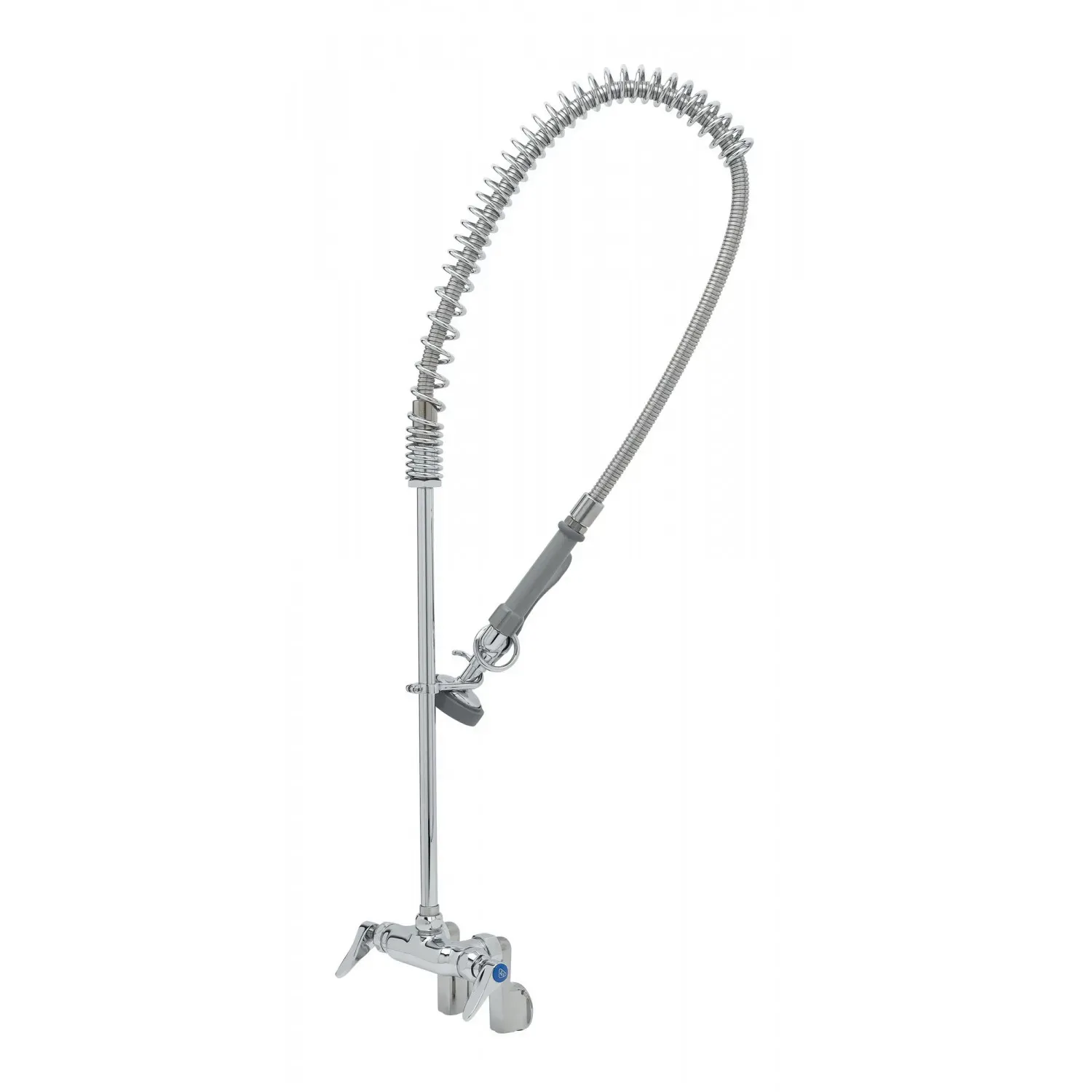 Maintain System Efficiency with the T&S Brass, B-2261, Pre-Rinse Faucet Assembly. Designed for commercial restaurant use, this pre-rinse faucet assembly from T&S Brass ensures optimal performance and convenience in your kitchen. The adjustable inlet wall mount mixing faucet features a polished chrome plated brass body, providing durability and a sleek appearance. With an EasyInstall 18" riser and a 44" flexible stainless steel hose, this assembly offers flexibility and ease of use. The heat resistant gray handle and hold down ring further enhance safety and control during operation. The B-0107 spray valve delivers a powerful spray for efficient rinsing, while the adjustable inlet centers allow for easy installation and customization. Upgrade your kitchen with the T&S Brass, B-2261, Pre-Rinse Faucet Assembly today.