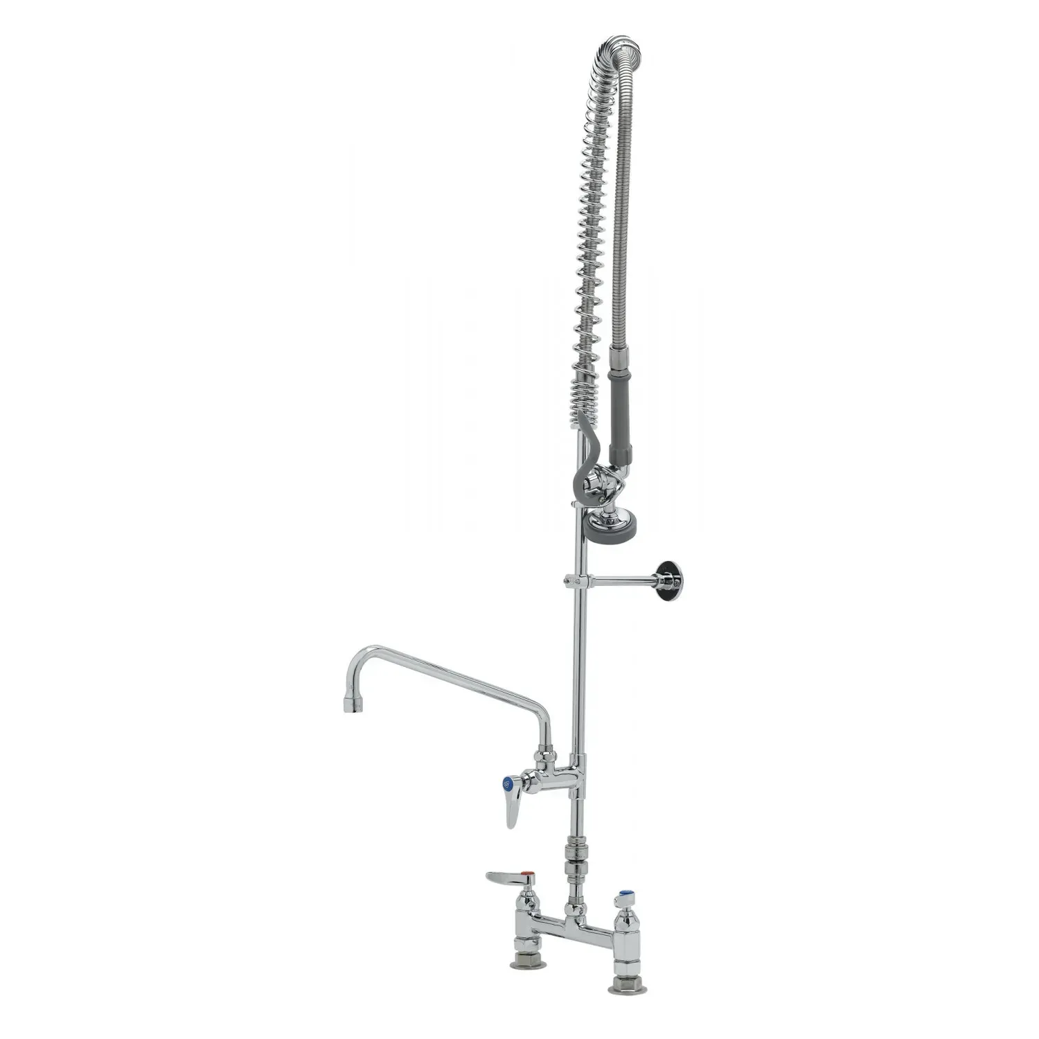 Maximize System Efficiency with the T&S Brass B-2277-01 Pre-Rinse Faucet Assembly with Add-On Faucet. This commercial-grade unit is designed to enhance productivity and streamline operations in any restaurant setting. The B-2277-01 features a 12" swing nozzle and a B-0107 spray valve, allowing for efficient pre-rinsing of dishes and utensils. The 8" deck mount mixing faucet with a polished chrome-plated brass body ensures durability and longevity, even in high-volume usage. The add-on faucet, also with a polished chrome-plated brass body, provides additional functionality and convenience. With an easy-install continuous pressure vacuum breaker, this pre-rinse unit can be quickly installed, saving time and effort. Whether you're running a bustling kitchen or a small eatery, the T&S Brass B-2277-01 Pre-Rinse Faucet Assembly with Add-On Faucet is the perfect choice to optimize your restaurant's efficiency and deliver exceptional results.