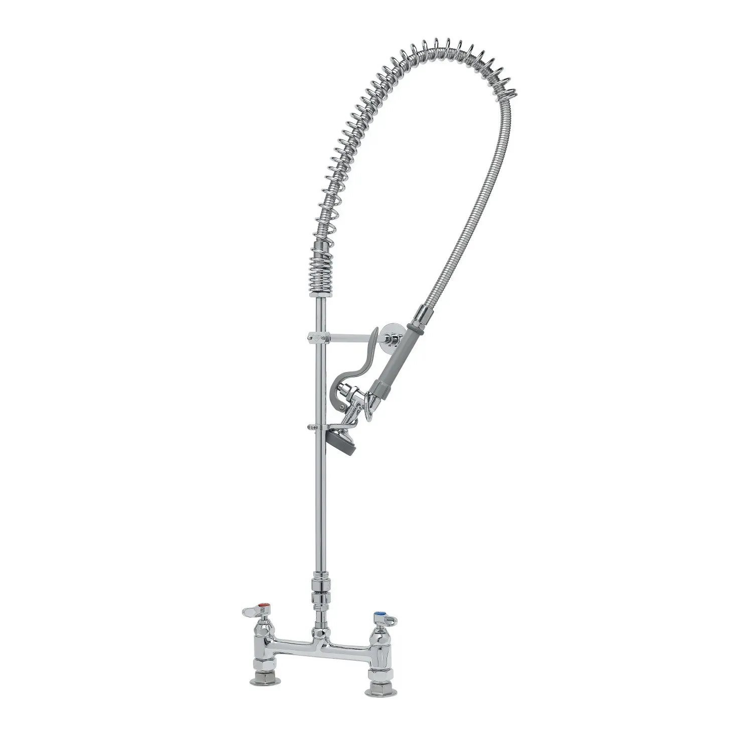 Maximize System Efficiency with the T&S Brass B-2277 Pre-Rinse Faucet Assembly. This commercial-grade unit is designed to enhance productivity and streamline operations in any restaurant setting. With its easy-install riser and continuous pressure vacuum breaker, this pre-rinse unit ensures quick and efficient installation while maintaining optimal water flow. The 8" deck mount polished chrome plated brass body adds a touch of elegance to any kitchen, while the included B-0107 Spray Valve delivers a powerful spray for thorough cleaning. The inlet supply nipples and 12" wall bracket provide stability and support, making this assembly a reliable choice for busy kitchens. Upgrade your kitchen with the T&S Brass B-2277 and experience improved efficiency and performance.