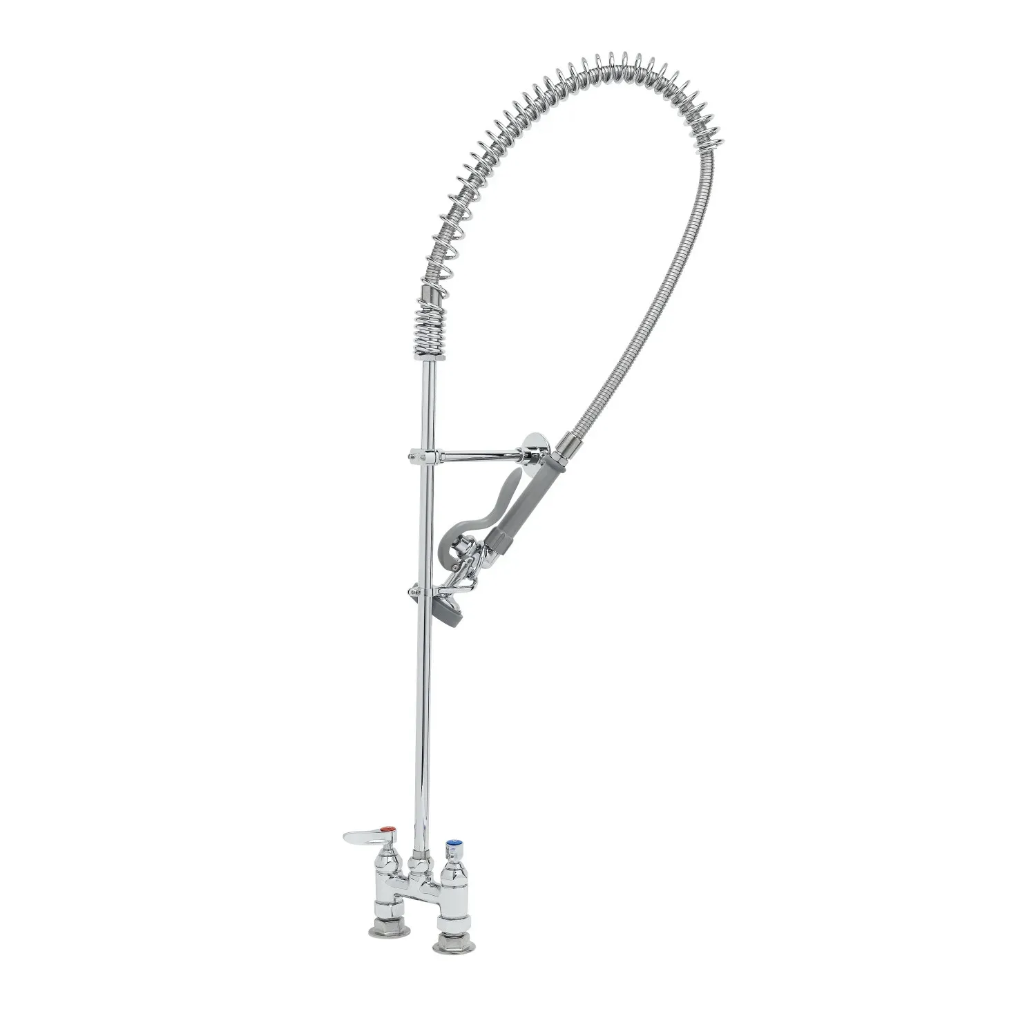 Maintain Equipment Functionality with the T&S Brass, B-2290, Pre-Rinse Faucet Assembly. This deck mount pre-rinse faucet is designed to meet the demands of a busy commercial restaurant kitchen. With its 4" centers and 1/2" NPT supply nipples, it provides a reliable and efficient solution for maintaining cleanliness and hygiene. The polished chrome plated brass body not only adds a touch of elegance but also ensures durability and longevity. The EasyInstall riser allows for quick and hassle-free installation, saving valuable time in a fast-paced environment. The 44" flexible stainless steel hose with a heat-resistant gray handle and hold-down ring provides flexibility and ease of use, allowing for thorough rinsing of dishes and utensils.