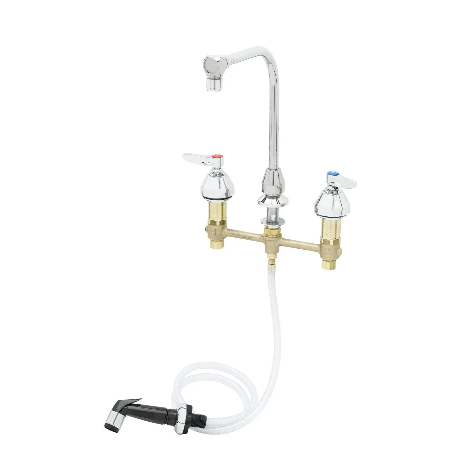 Secure System Operation with T&S Brass, B-2347-06, Manual Faucets. This medical faucet is designed for commercial restaurant use, ensuring a secure and efficient system operation. With its 8" concealed deck mount and high-arc gooseneck, this faucet provides easy access to water for various tasks in the kitchen. The lever handles offer smooth and precise control, allowing users to adjust the water flow and temperature with ease. The included sidespray adds versatility, making it convenient to rinse dishes and clean hard-to-reach areas. Certified to meet ASME, CSA, NSF, and ADA requirements, this faucet guarantees reliability and compliance with industry standards. The chrome-plated escutcheons add a touch of elegance to any restaurant decor. With its durable construction and reliable performance, the T&S Brass B-2347-06 is the perfect choice for commercial kitchens, ensuring a secure and efficient water supply for all your restaurant needs.