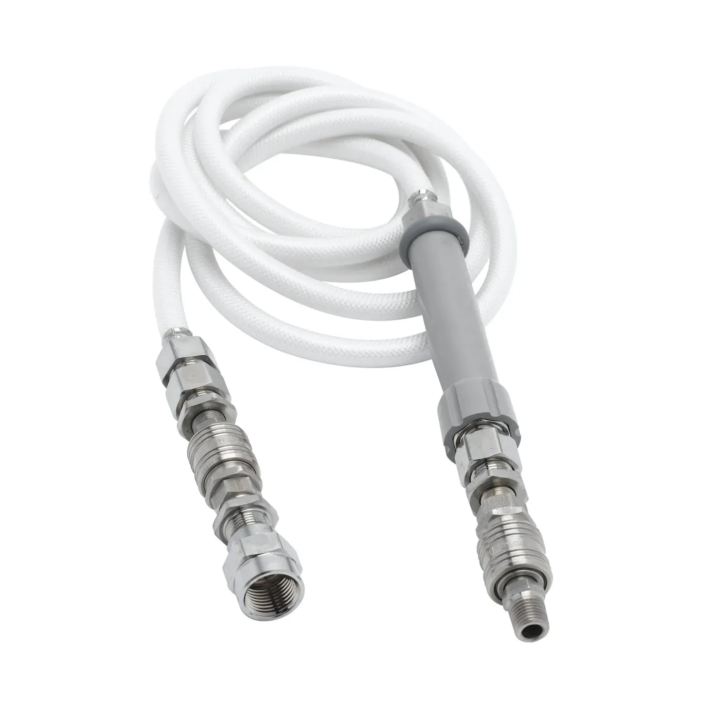 Maximize productivity levels with the T&S Brass B-2395 Flexible Hoses & Hose Assemblies. Designed specifically for commercial restaurant use, this high-quality hose is a must-have for any kitchen. With 8 flexible FDA food grade reinforced PVC hoses, it ensures safe and sanitary food handling. The quick-disconnect coupling with a 1/4 NPT male plug and 3/8" male socket allows for easy installation and removal, saving valuable time and effort. The 1/4" NPT male outlet provides a reliable connection to your equipment, ensuring a steady flow of water. Whether you're washing dishes, cleaning countertops, or filling pots, the T&S Brass B-2395 Flexible Hoses & Hose Assemblies will streamline your operations and enhance efficiency in your commercial kitchen. Invest in this essential tool and experience the difference it makes in your restaurant's workflow.