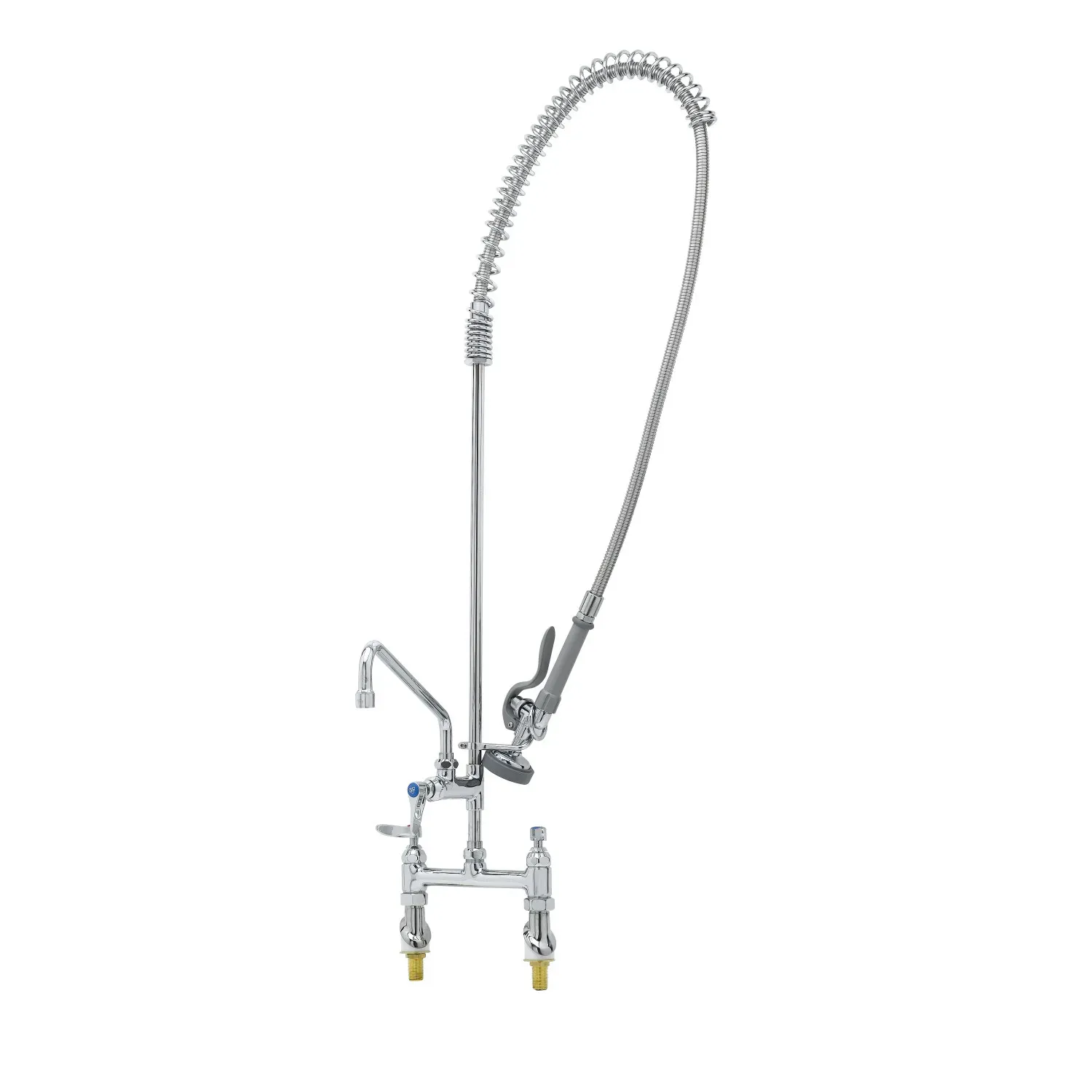 Improve System Functionality with the T&S Brass B-2430 Pre-Rinse Units. Designed specifically for commercial restaurant use, this pre-rinse unit from T&S Brass is a must-have for any busy kitchen. With its polished chrome plated brass body, this unit not only looks sleek but also ensures durability and longevity. The 8" deck mount mixing faucet and 12" swing nozzle with a stream regulator outlet provide maximum flexibility and convenience, allowing for easy rinsing and cleaning of dishes and utensils. The easy-install add-on faucet further enhances the functionality of this unit. Whether you're running a small cafe or a large restaurant, the T&S Brass B-2430 Pre-Rinse Units will help streamline your kitchen operations, saving you time and effort. Trust in T&S Brass, a reputable vendor known for their high-quality products. Upgrade your kitchen today with this reliable and efficient pre-rinse unit.