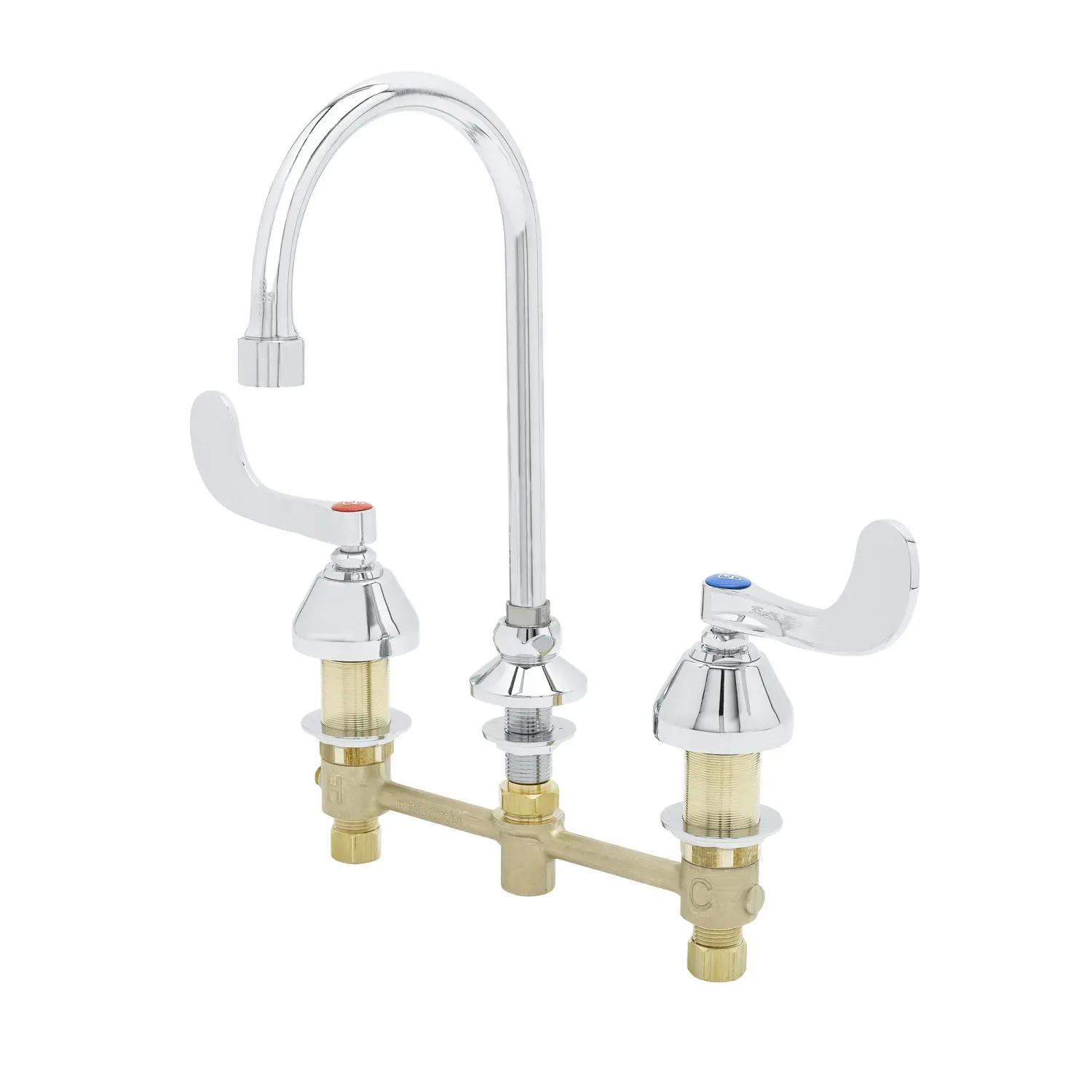 Optimize Equipment Performance with the T&S Brass B-2862-LF16-WH4 Manual Faucet. This 8" concealed deck mount mixing faucet is designed to enhance efficiency in commercial restaurant settings. With its forged brass body and polished chrome plated escutcheons, this faucet not only ensures durability but also adds a touch of elegance to any kitchen. The 8 3/4" swivel/rigid gooseneck with a stream regulator outlet allows for easy maneuverability and precise water flow control. The 1.5 GPM flow disc in the swivel piece ensures water conservation without compromising performance. The compression cartridges with spring checks provide reliable operation, while the 4" wrist action handles offer ergonomic control. Certified to ASME A112.18.1/CSA B125.1, NSF 61-Section 9, and NSF 372, this faucet meets the highest industry standards. Upgrade your restaurant's functionality and style with the T&S Brass B-2862-LF16-WH4 Manual Faucet.