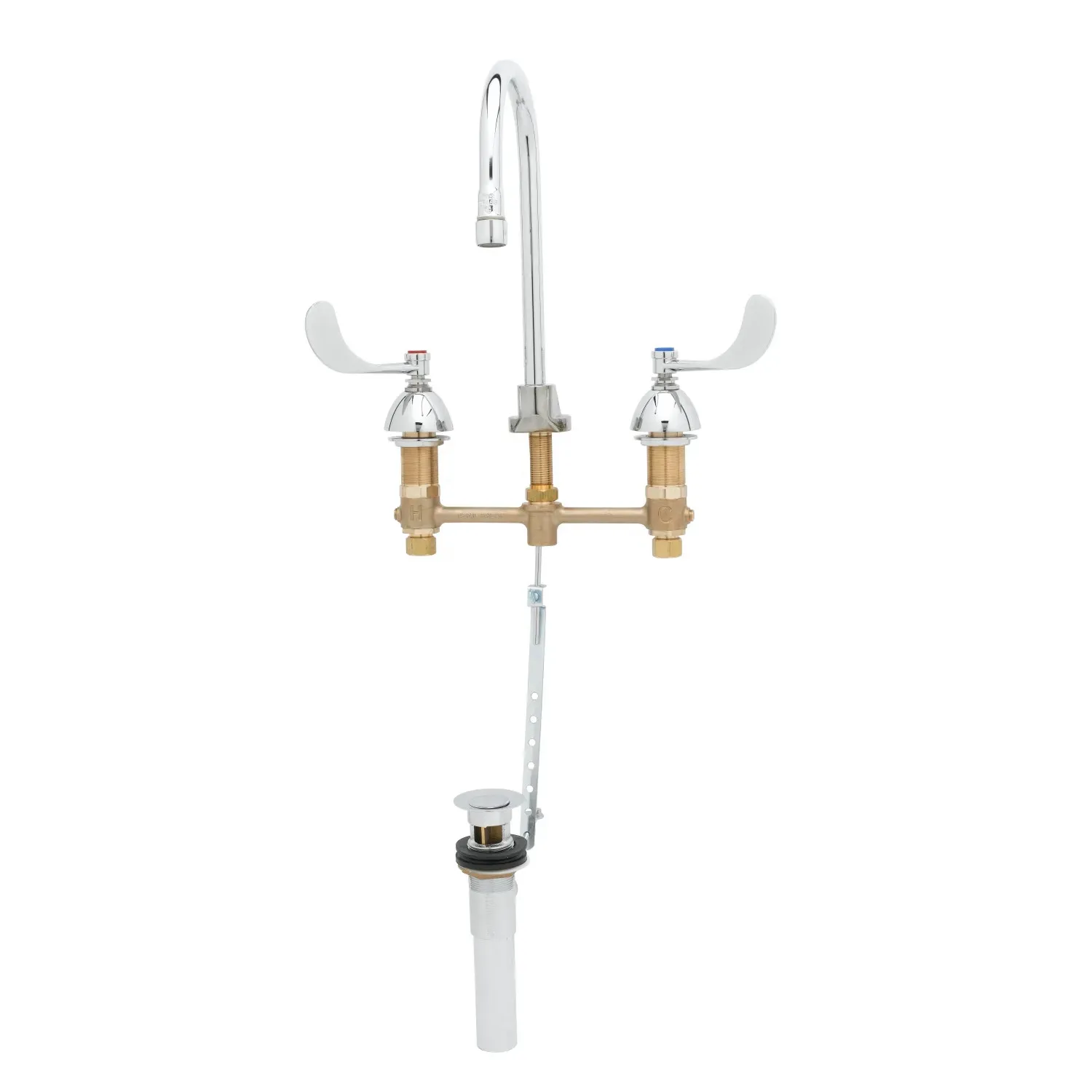 Maintain Operational Safety with the T&S Brass B-2869-04 Manual Faucet. Designed specifically for commercial restaurant use, this lavatory faucet ensures reliable performance and durability. The concealed body and 8" centers provide a sleek and seamless appearance, while the swivel/rigid gooseneck allows for easy maneuverability and precise water control. The wrist handles offer convenient operation, promoting hygiene and reducing the risk of cross-contamination. With a pop-up drain and chrome plated escutcheons, this faucet adds a touch of elegance to any restaurant setting. Certified to meet ASME, CSA, NSF, and ADA requirements, you can trust in its quality and compliance. The compression cartridges with spring checks and 2.2 GPM aerator ensure efficient water flow and conservation. Upgrade your restaurant's lavatory with the T&S Brass B-2869-04 Manual Faucet and enjoy enhanced safety, functionality, and style.