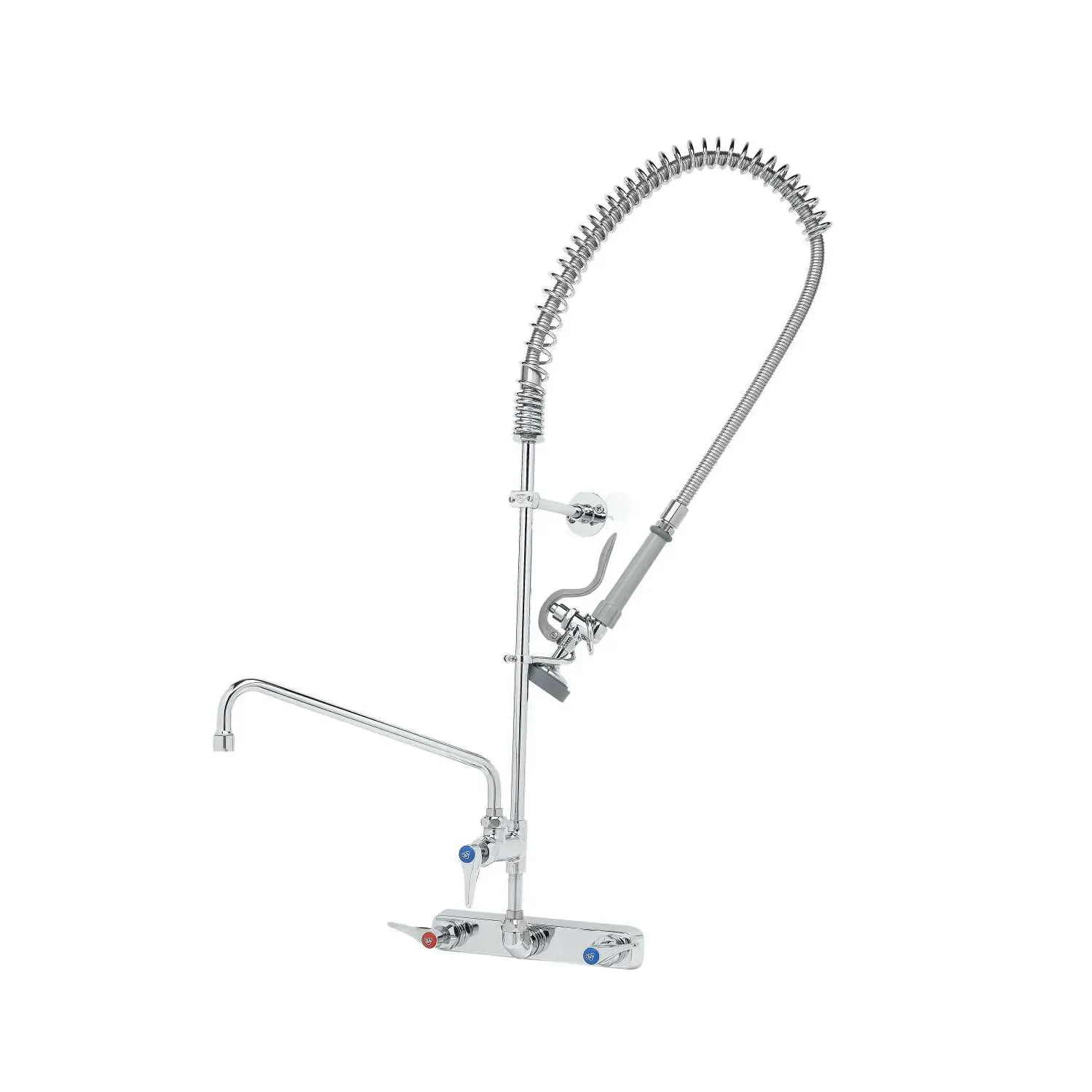 Ensure smooth operation with the T&S Brass B-5125-12-B Pre-Rinse Faucet Assembly. Designed specifically for commercial restaurant use, this 8" wall mount workboard pre-rinse unit is equipped with Eterna technology for long-lasting performance. The polished chrome plated brass body not only adds a sleek look to your kitchen but also ensures durability and resistance to corrosion. The included 12" add-on faucet provides additional versatility, allowing you to easily switch between tasks. With a 12" swing nozzle and stream regulator outlet, this pre-rinse faucet assembly offers precise control over water flow, making it ideal for rinsing dishes, pots, and pans. The easy-install design ensures quick and hassle-free installation, saving you time and effort. Trust T&S Brass, a reputable vendor in the industry, to deliver a high-quality product that meets the demands of a busy commercial kitchen. Upgrade your restaurant's efficiency and functionality with the T&S Brass B-5125-12-B Pre-Rinse Faucet Assembly.