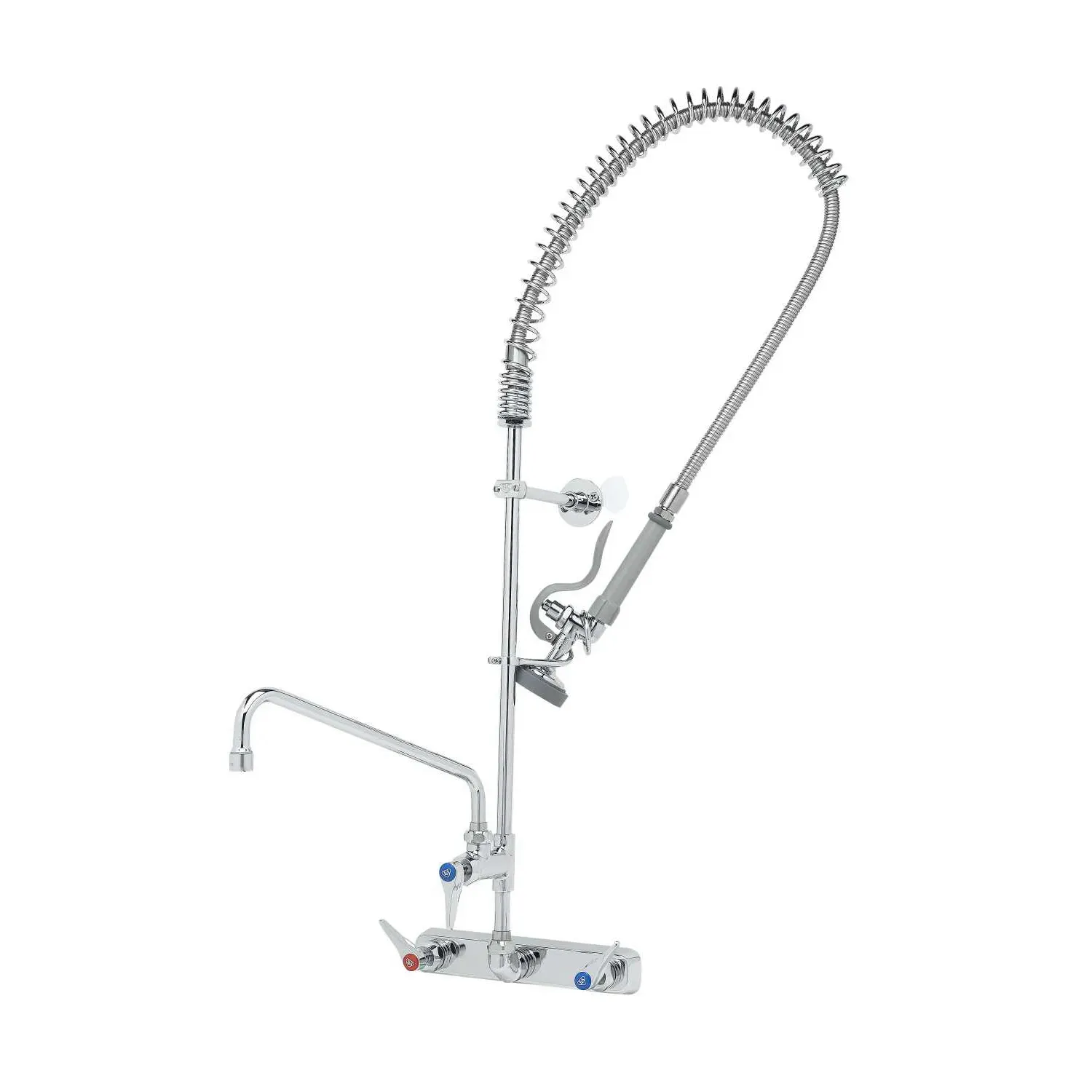 Introducing the T&S Brass, B-5125-12-CR-B, Pre-Rinse Faucet Assembly, with Add On Faucet. This 8" wall mount workboard pre-rinse unit is perfect for commercial restaurant use. With its polished chrome plated brass body, it not only adds a touch of elegance to your kitchen but also ensures durability and longevity. The easy-install add-on faucet with a 12" swing nozzle and stream regulator outlet provides versatility and convenience for various tasks. The Cerama ceramic cartridge technology guarantees smooth operation and drip-free performance. This pre-rinse faucet assembly comes with a wall bracket for easy installation and stability. Designed by T&S Brass, a trusted name in the industry, this unit is built to withstand the demands of a busy restaurant kitchen. Streamline your workflow and enhance efficiency with this reliable and high-quality pre-rinse faucet assembly.
