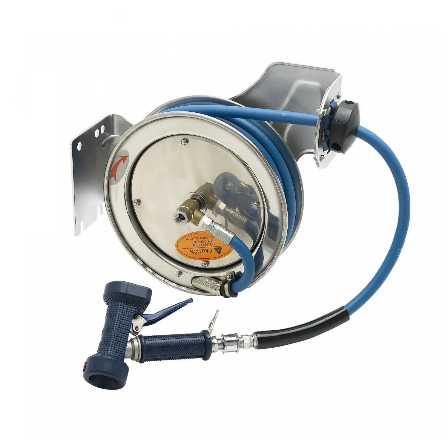 Enhance System Reliability with the T&S Brass B-7112-02 Hose Reel Assembly. Designed specifically for commercial restaurant use, this stainless steel hose reel is built to withstand the demands of a busy kitchen. The open design allows for easy access and quick hose retrieval, ensuring efficient operation during busy service hours. The included MV-2516-24 rear trigger gun provides precise control and is equipped with a 5/16" orifice and swivel for optimal performance. The heavy-duty non-marking hose measures 3/8" in diameter and extends up to 15 feet, offering ample reach for various tasks. With a maximum pressure rating of 300 PSI, this hose reel assembly delivers reliable water flow for a range of applications, from dishwashing to food preparation. Trust T&S Brass for durable, high-quality equipment that keeps your restaurant running smoothly.