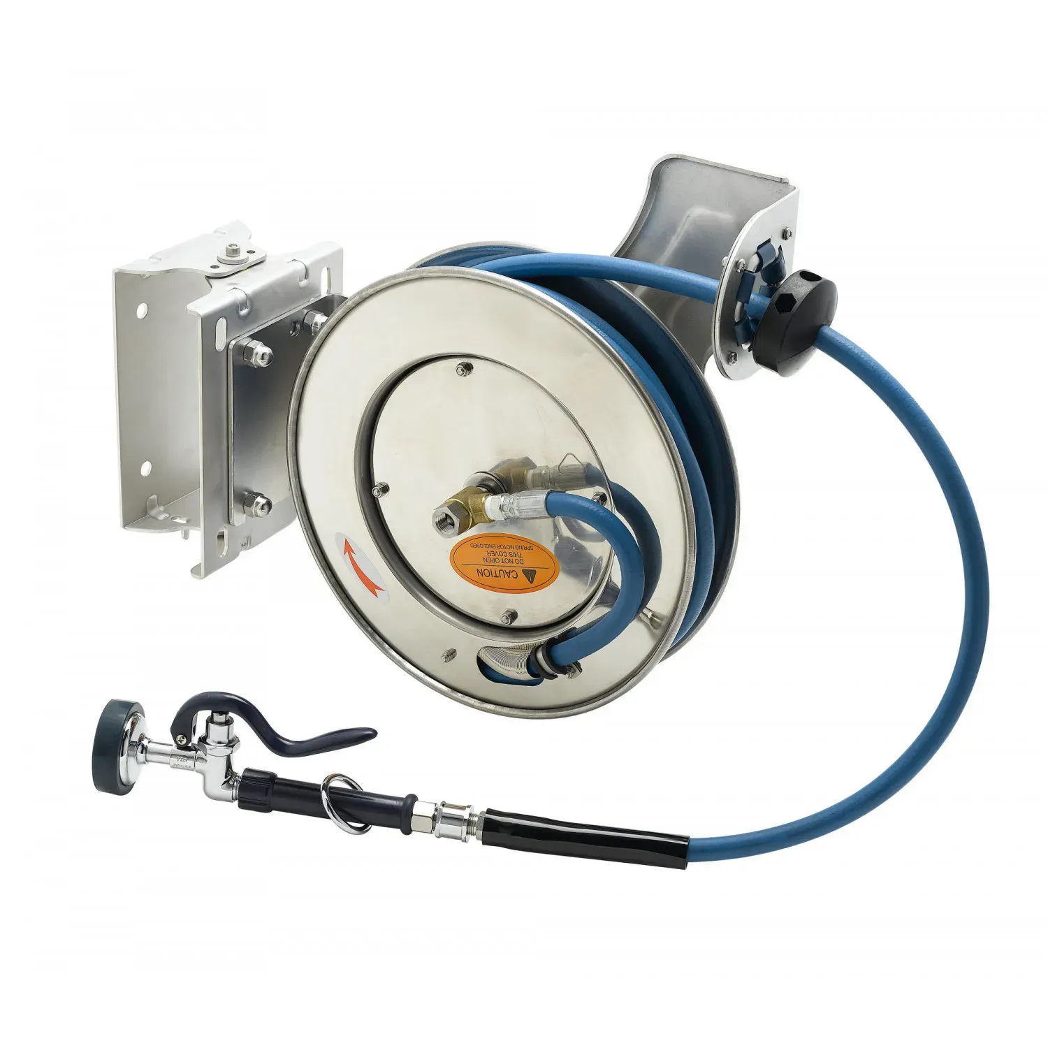 Upgrade System Quality with T&S Brass, B-7132-01-ESB, Hose Reel Assembly. This high-quality hose reel is designed to meet the demands of a busy commercial restaurant. The open stainless steel reel ensures easy access and storage of the 3/8" x 35' heavy-duty non-marking hose, which is rated to 300 PSI for reliable performance. The included blue high flow spray valve with swivel allows for precise control and efficient cleaning. With its stainless steel swing bracket, this hose reel assembly is built to withstand the rigors of a commercial kitchen environment. Whether you need to clean dishes, floors, or equipment, this hose reel assembly provides the durability and functionality you need. Trust T&S Brass, a trusted name in the industry, to upgrade your system quality and enhance the efficiency of your restaurant operations.