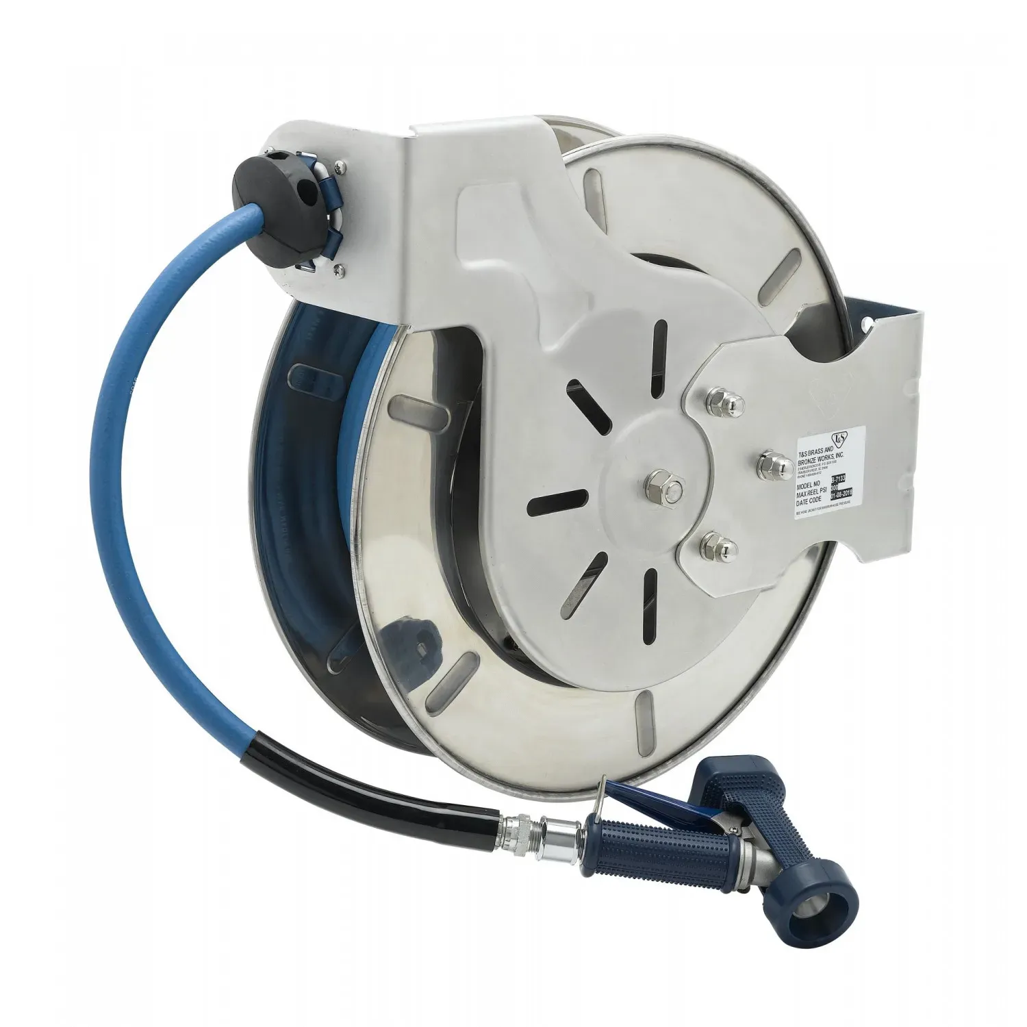 Secure System Operation with T&S Brass, B-7133-02, Hose Reel Assembly. This open stainless steel hose reel is designed to provide reliable and efficient water supply in commercial restaurant settings. With a 1/2" x 35' heavy-duty non-marking hose rated to 300 PSI, it ensures a steady flow of water for various tasks. The stainless steel rear trigger water gun and swivel with a 5/16" orifice and 1/2" NPT male inlet offer precise control and easy maneuverability. Whether it's washing dishes, cleaning floors, or rinsing produce, this hose reel assembly is a must-have for any busy kitchen. Its durable construction and high-quality components make it a long-lasting and reliable solution for all your water supply needs. Trust T&S Brass for secure system operation and enhance the efficiency of your restaurant operations.