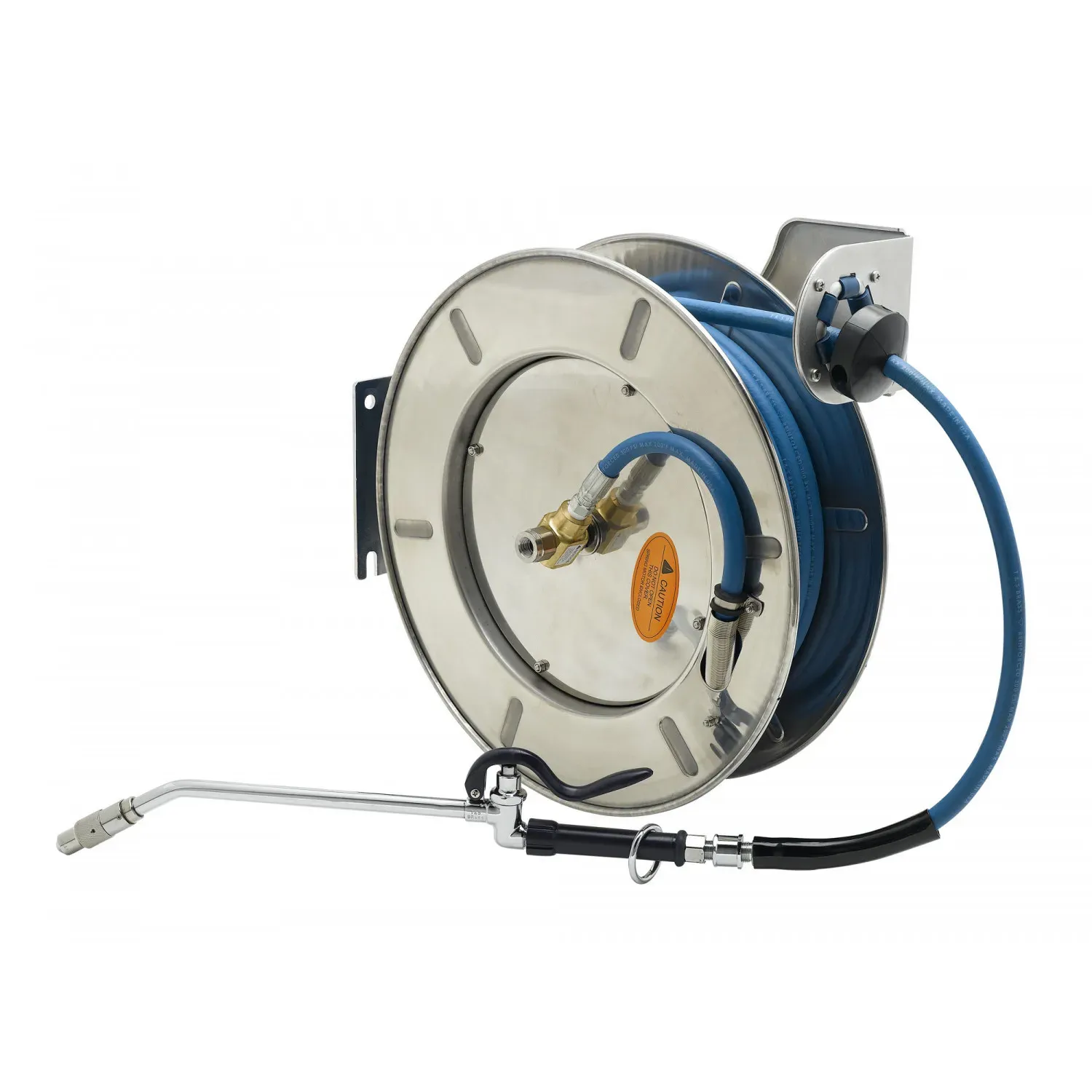 Facilitate Equipment Use with the T&S Brass, B-7142-10, Hose Reel Assembly. This stainless steel hose reel is designed to enhance efficiency and convenience in a commercial restaurant setting. With a 3/8" x 50' heavy-duty non-marking hose rated to 300 PSI, it provides ample reach and durability for various tasks. The open reel design allows for easy access and storage, while the extended spray wand with a swivel ensures precise control and flexibility. Whether it's washing dishes, cleaning floors, or rinsing produce, this hose reel assembly is a reliable companion. Upgrade your restaurant's equipment with the T&S Brass, B-7142-10, Hose Reel Assembly and experience improved productivity and convenience.