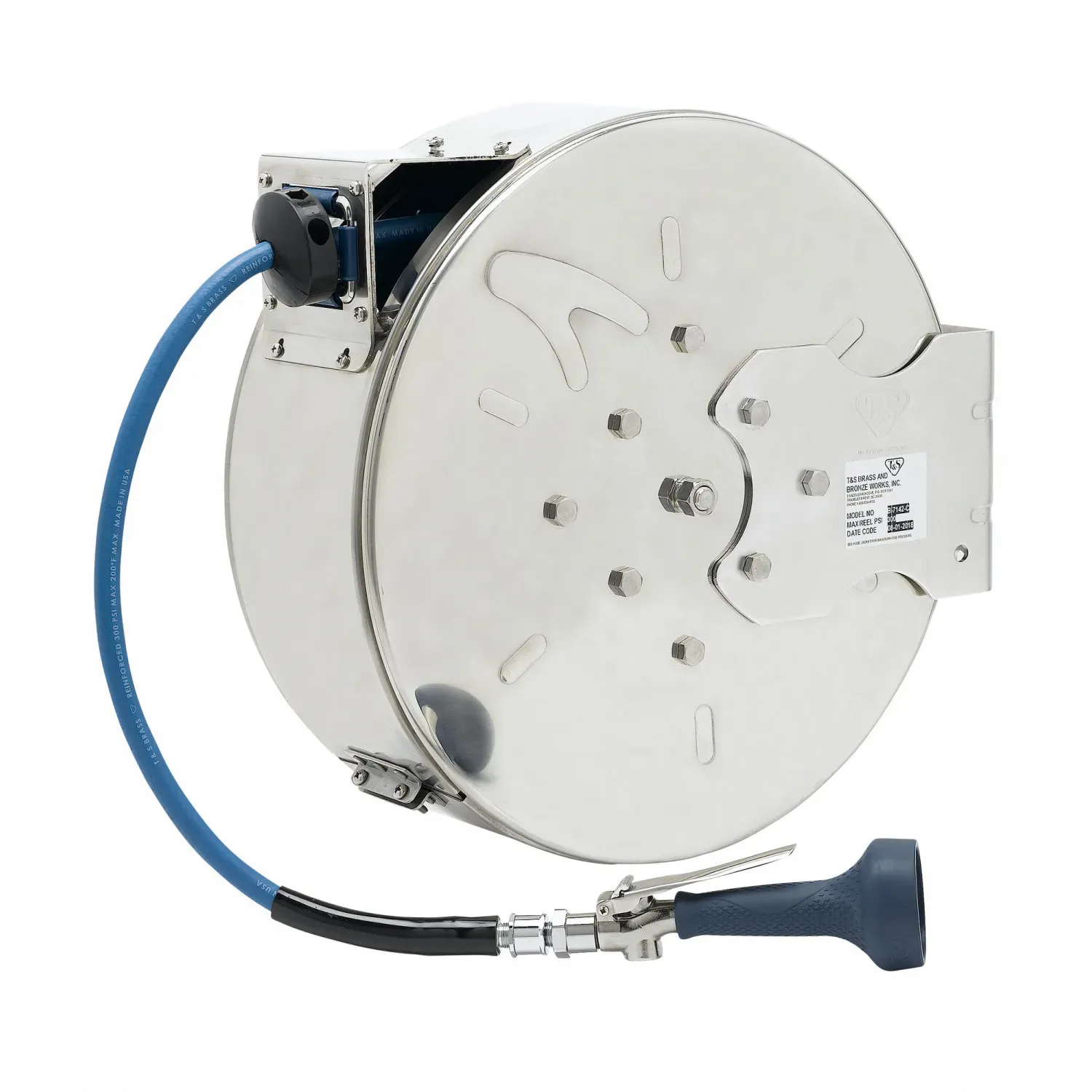 Facilitate Equipment Use with the T&S Brass, B-7142-C08M, Hose Reel Assembly. This enclosed stainless steel hose reel is designed to enhance efficiency and convenience in a commercial restaurant setting. With a 3/8" x 50' heavy-duty non-marking hose rated to 300 PSI, it provides ample reach and durability for various tasks. The 1.07 GPM JeTSpray valve with a heat-insulated handle and swivel allows for precise control and easy maneuverability, ensuring optimal performance. The stainless steel construction ensures longevity and resistance to corrosion, making it suitable for demanding kitchen environments. Whether it's for washing dishes, cleaning surfaces, or filling containers, this hose reel assembly offers a reliable solution. Upgrade your restaurant's equipment with the T&S Brass, B-7142-C08M, Hose Reel Assembly and experience enhanced productivity and convenience.