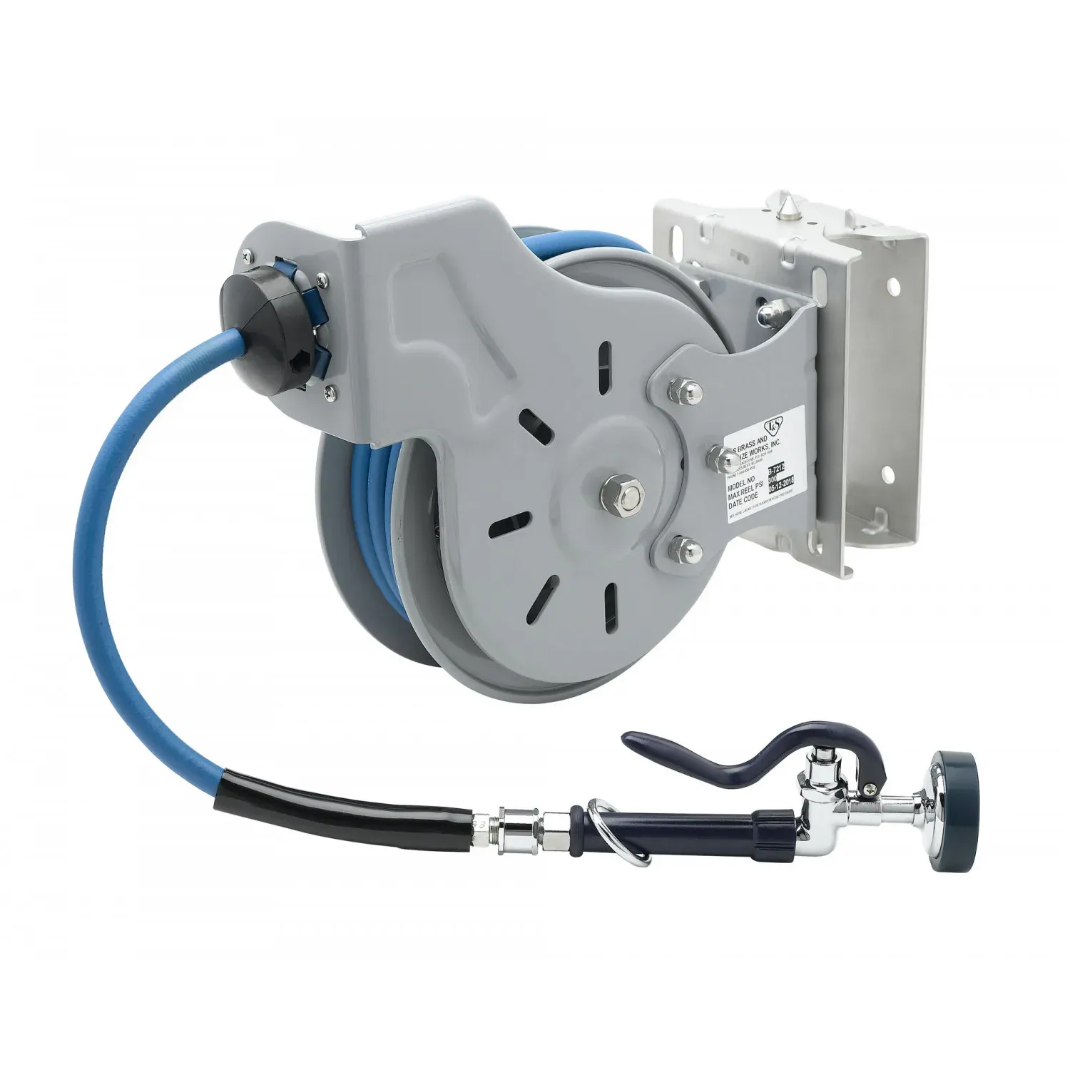 Improve system performance with the T&S Brass B-7212-01-ESB Hose Reel Assembly. Designed specifically for commercial restaurant use, this hose reel assembly is a must-have for any busy kitchen. The open epoxy coated steel reel ensures durability and longevity, while the 3/8" x 15' heavy-duty non-marking hose provides flexibility and ease of use. With a blue high flow spray valve and swivel, this assembly allows for efficient and precise water flow control. Rated to 300 PSI, it can handle even the toughest cleaning tasks. The stainless steel swing bracket adds stability and convenience, making it easy to access and store the hose when not in use.