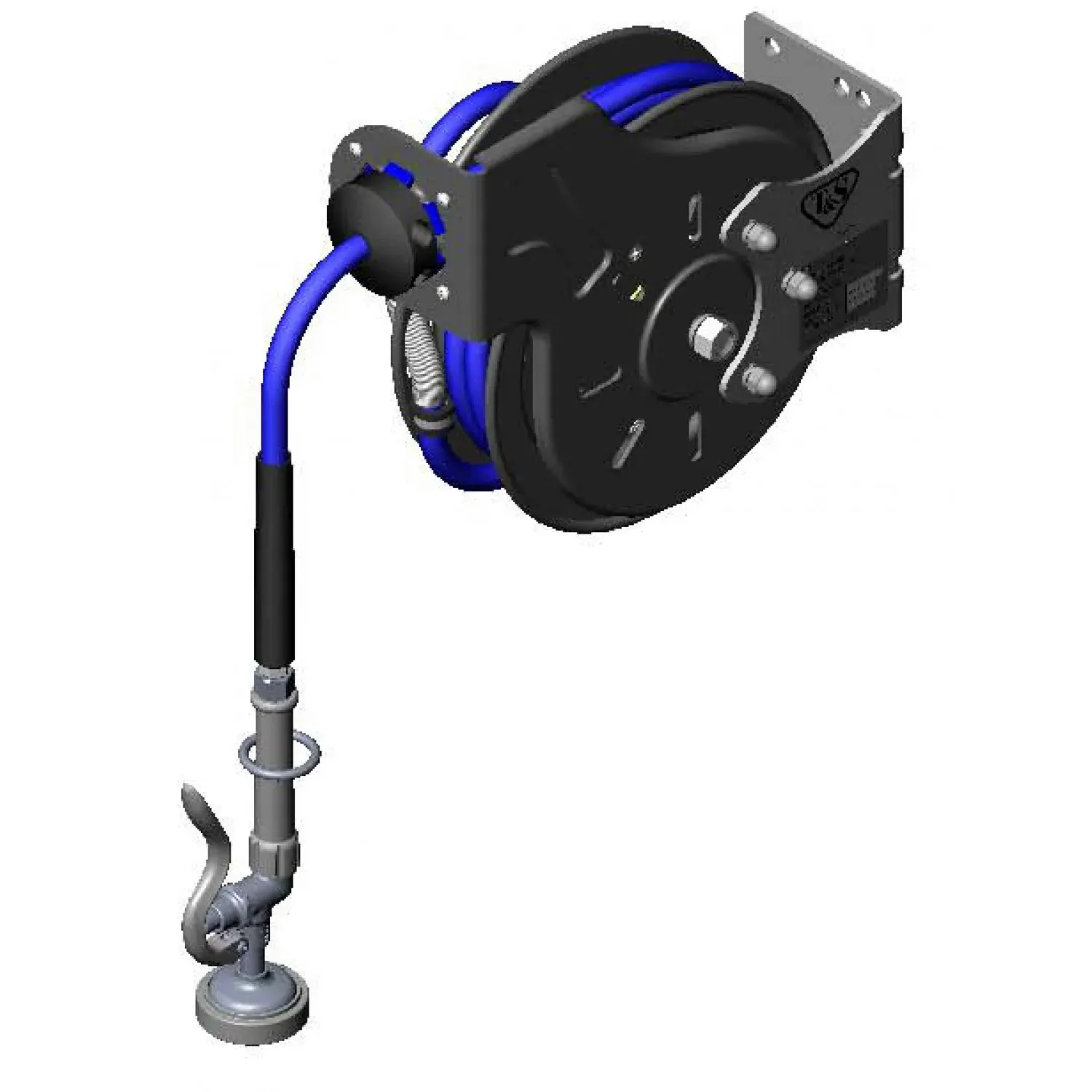 Upgrade Operational Reliability with the T&S Brass B-7212-01M Hose Reel Assembly. This open, epoxy coated hose reel is designed to enhance efficiency and durability in commercial restaurant settings. With a 3/8"x15' heavy-duty non-marking hose rated to 300 PSI, it can withstand the demands of a busy kitchen while ensuring a consistent water supply. The included B-0107 spray valve with swivel offers a flow rate of 1.15 GPM, allowing for precise control and efficient cleaning. Whether you need to rinse dishes, clean equipment, or maintain a sanitary environment, this hose reel assembly is a reliable choice. Upgrade your restaurant's operational reliability with the T&S Brass B-7212-01M Hose Reel Assembly.