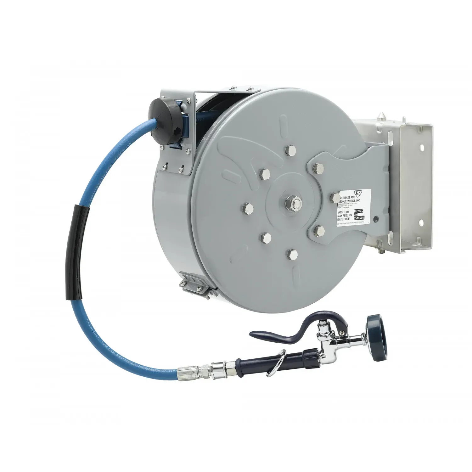 Enhance System Reliability with the T&S Brass B-7222-C01-ESB Hose Reel Assembly. This high-quality assembly is designed to meet the demands of a commercial restaurant setting, ensuring durability and efficiency. The enclosed epoxy coated steel hose reel provides added protection and longevity, while the blue high flow spray valve with swivel allows for easy maneuverability and precise control. The 3/8" x 30 heavy-duty non-marking hose, rated to 300 PSI, ensures optimal water flow and pressure for various tasks in the kitchen. With its robust construction and reliable performance, this hose reel assembly from T&S Brass is a valuable addition to any restaurant's plumbing system. Trust in the brand's expertise and reputation for delivering top-notch products that enhance the reliability and functionality of your restaurant operations.