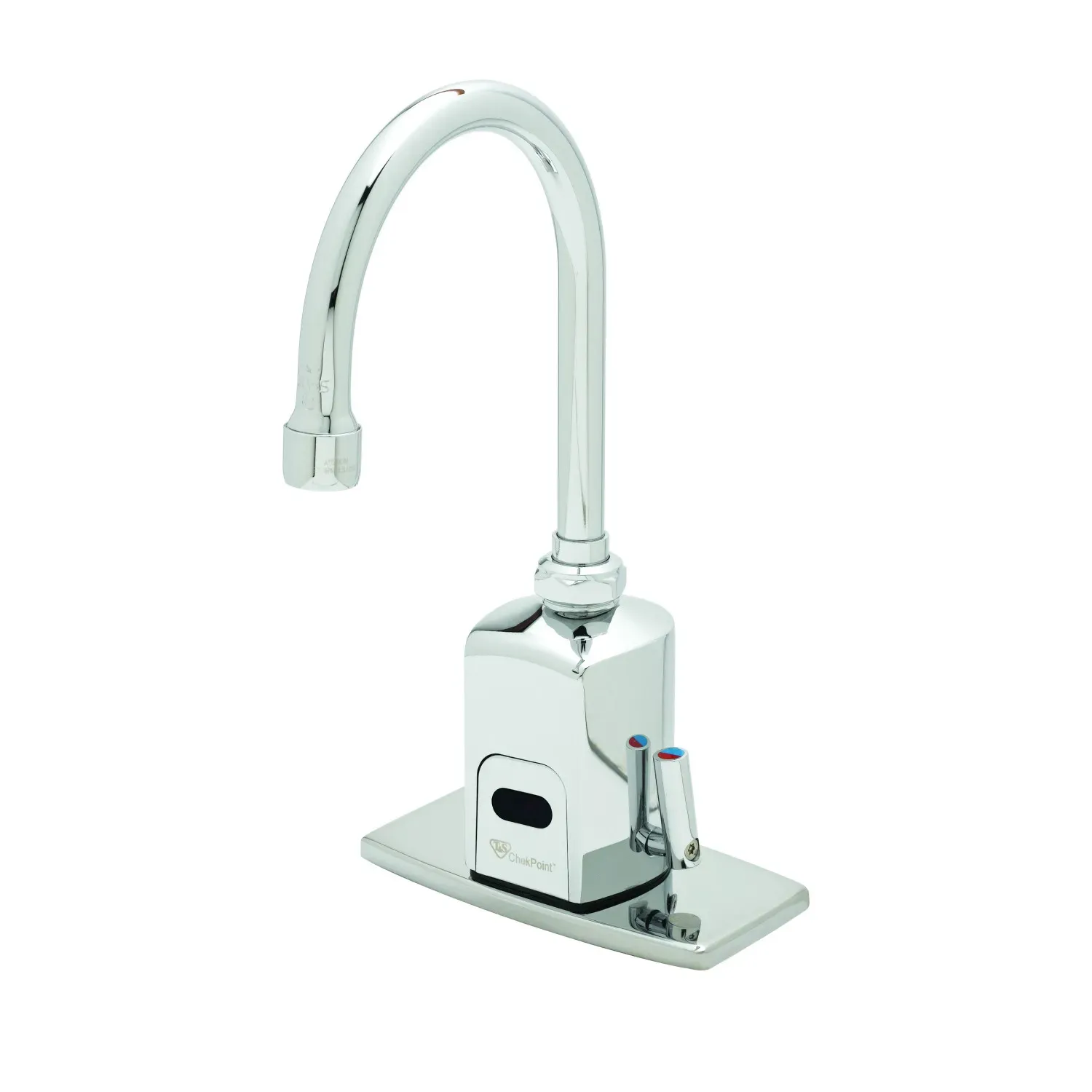 Ensure Reliable Functionality with T&S Brass EC-3130-4DP Sensor Faucets. Designed specifically for commercial restaurant use, this sensor faucet guarantees efficient and hygienic operation. The single-hole deck mount electronic sensor faucet features a polished chrome plated brass body for durability and a 5 7/16" swivel gooseneck for easy maneuverability. With a 2.2 GPM vandal-resistant aerator, this faucet ensures a steady and controlled water flow, reducing water waste. The above deck electronic AC/DC control module includes internal flow control setting switches and an above deck temperature mixing handle for precise control over water temperature. The faucet also comes with 19" flexible stainless steel supply hoses and check valve adapters for easy installation. Certified to meet ASME A112.18.1/CSA B125.1, NSF 61-Section 9, NSF 372, and UL 1951 standards, this sensor faucet is reliable and safe to use. Upgrade your restaurant's functionality with T&S Brass EC-3130-4DP Sensor Faucets.
