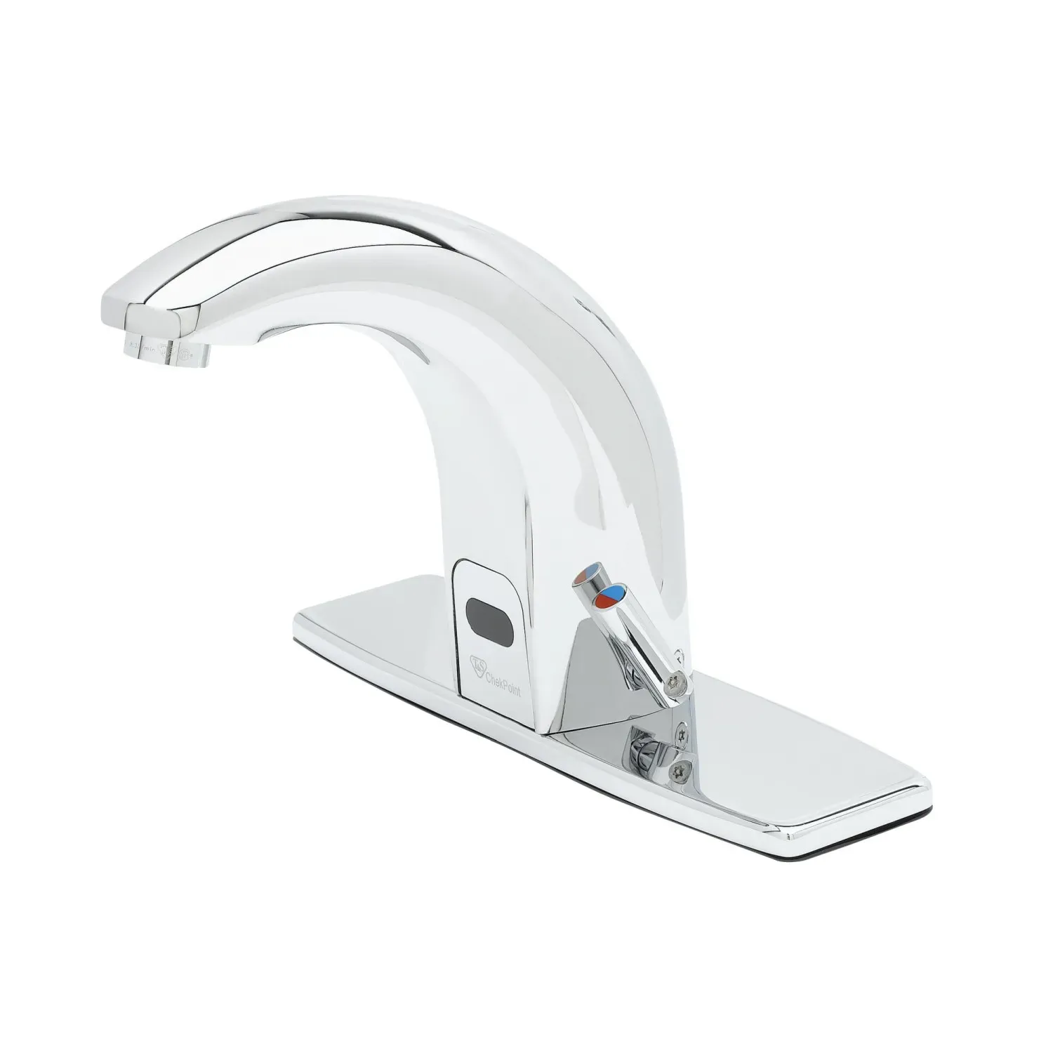 Maximize Equipment Performance with T&S Brass, EC-3142-8DP, Sensor Faucets. This ChekPoint Above-Deck Electronic Faucet is designed for commercial restaurant use, offering convenience and efficiency. The faucet features a contemporary spout and an 8" deck plate, providing a sleek and modern look to any establishment. With a 2.2 GPM vandal-resistant aerator, this faucet ensures a steady and powerful water flow, perfect for busy kitchens. The above-deck electronic AC/DC control module with internal flow control setting switches allows for easy operation and customization. Additionally, the faucet includes an above-deck temperature mixing handle, ensuring precise control over water temperature. The 19" flexible stainless steel supply hoses and check valve adapters with 3/8" compression connections provide durability and reliability. Certified to various standards, including ASME A112.18.1/CSA B125.1 and NSF 61-Section 9, this faucet guarantees safety and quality. Upgrade your restaurant's equipment with the T&S Brass EC-3142-8DP Sensor Faucet for enhanced performance and customer satisfaction.