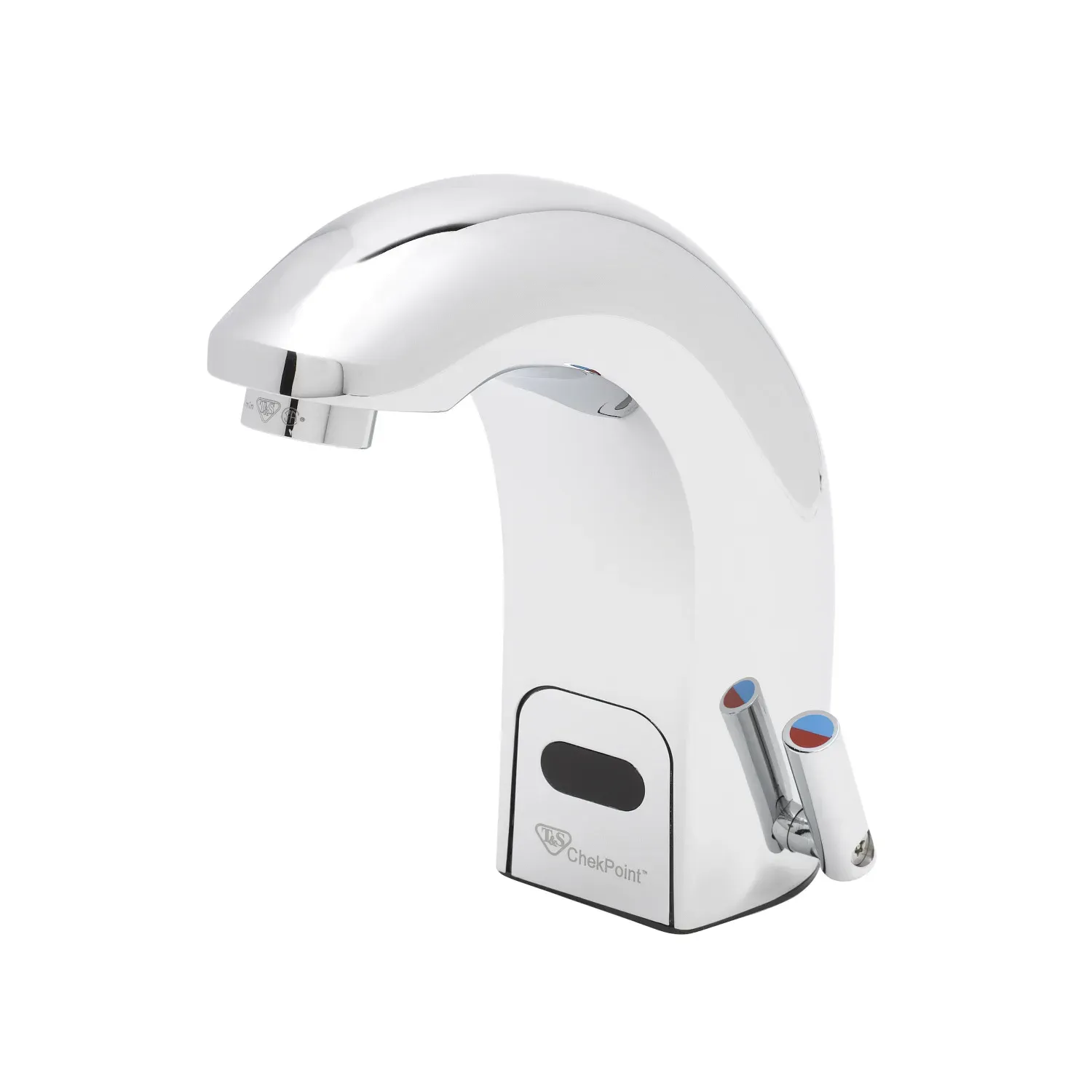 Enhance Equipment Performance with T&S Brass, EC-3142, Sensor Faucets. This ChekPoint Above-Deck Electronic Faucet is designed for commercial restaurant use, offering convenience and efficiency. With its single-hole deck mount and contemporary spout, this faucet combines style and functionality. The polished chrome plated brass body ensures durability and longevity, while the 2.2 GPM vandal-resistant aerator provides a steady and controlled flow of water. The above-deck electronic AC/DC control module allows for easy operation and includes internal flow control setting switches. The faucet also features an above-deck temperature mixing handle and anti-rotation pin for added convenience and safety. With 19" flexible stainless steel supply hoses and check valve adapters, installation is a breeze. Certified to meet various industry standards, including ASME A112.18.1/CSA B125.1, NSF 61-Section 9, NSF 372, and UL 1951, this sensor faucet ensures compliance and reliability. Upgrade your restaurant's equipment with T&S Brass, EC-3142, Sensor Faucets for enhanced performance and efficiency.