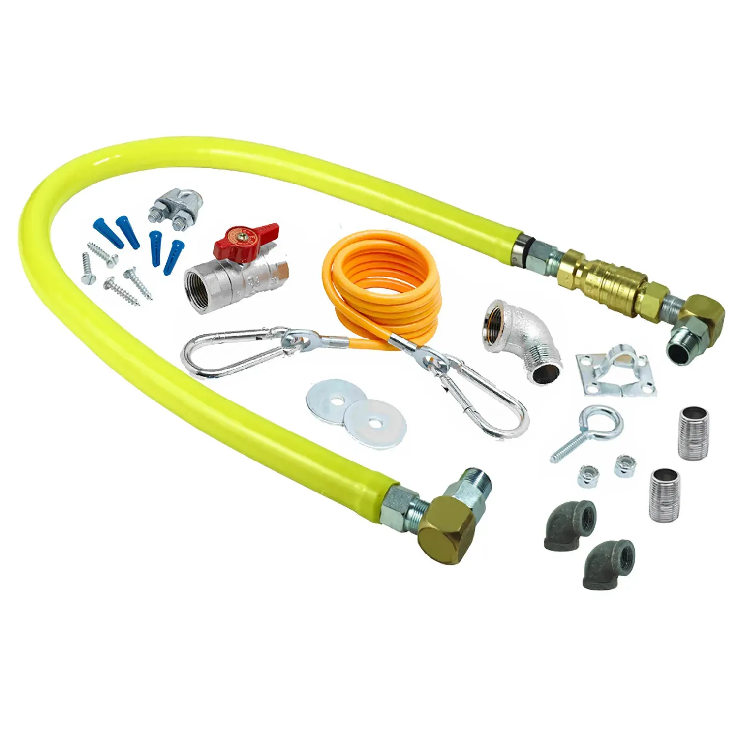 Optimize Equipment Performance with T&S Brass, HG-4D-48SK-FF, Gas Connector Hose Kit / Assembly. This high-quality kit is designed to enhance the performance of your commercial restaurant equipment. With its gas hose featuring a quick disconnect and a 3/4" NPT x 48" size, this kit ensures a secure and efficient gas connection. The included SwiveLinks allow for easy installation and flexibility, while the cable kit ensures proper support and stability. The ball valve, gas elbows, and nipples provide additional convenience and functionality. Whether you're setting up new equipment or replacing old components, this kit is a reliable choice that will optimize your restaurant's performance and ensure safe and efficient operation. Trust T&S Brass for all your commercial restaurant needs.