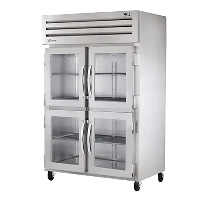 Achieve culinary excellence with the True Manufacturing STG2H-4HG Heated Cabinet, Reach-In. This top-of-the-line commercial appliance is designed to meet the demanding needs of a busy restaurant kitchen. With its four glass half doors, cam-lift hinges, and locks, you can easily access and secure your food items. The digital temperature control ensures precise heat regulation, while the six chrome shelves provide ample storage space. Made in the USA, this heated cabinet features a stainless steel front, aluminum sides, and an aluminum interior, making it durable and easy to clean. The 5" castors allow for easy mobility, and the 3.0 kW power ensures efficient heating. Whether you need to keep your dishes warm or hold pre-cooked food at the perfect temperature, the True Manufacturing STG2H-4HG Heated Cabinet, Reach-In is the ideal solution for your commercial restaurant.