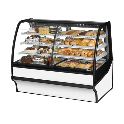 Deliver food perfection with the True Manufacturing TDM-DZ-59-GE/GE-W-W Display Case. This dual-zone merchandiser is designed to meet the needs of commercial restaurants, offering both dry and refrigerated storage options. With a spacious 59-1/4" width, this display case provides ample room for showcasing your delectable creations. The curved glass front and glass sides create an elegant and enticing display, while the two rear sliding glass doors allow for easy access and restocking. The three tiered levels of adjustable white PVC coated wire shelves provide flexibility in organizing your products, and the LED interior lighting ensures that your items are beautifully illuminated. Made in the USA, this display case features a white powder coated exterior and interior for a clean and professional look. With its reliable self-contained refrigeration system and R290 Hydrocarbon refrigerant, this display case is energy-efficient and environmentally friendly. Trust True Manufacturing to deliver the quality and performance your restaurant deserves.