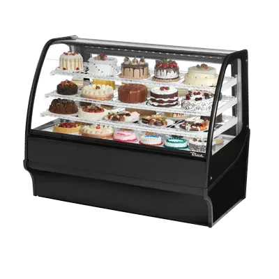 Achieve culinary excellence with the True Manufacturing TDM-R-59-GE/GE-B-W Display Case, Refrigerated Bakery. This top-of-the-line display merchandiser is designed to meet the needs of commercial restaurants, ensuring your baked goods are showcased in the most enticing way possible. The curved glass front and glass sides provide a clear view of your delectable treats, while the two rear sliding glass doors allow for easy access and restocking. With three tiered levels of adjustable white PVC coated wire shelves, you can arrange your pastries, cakes, and breads to perfection. The LED interior lighting illuminates your products, making them even more irresistible to customers. Made in the USA by True Manufacturing, this display case features a black powder coated exterior and a white powder coated interior for a sleek and professional look. With its self-contained refrigeration system and R290 Hydrocarbon refrigerant, this display case is not only efficient but also environmentally friendly. Trust True Manufacturing to deliver the quality and reliability you need for your commercial bakery.