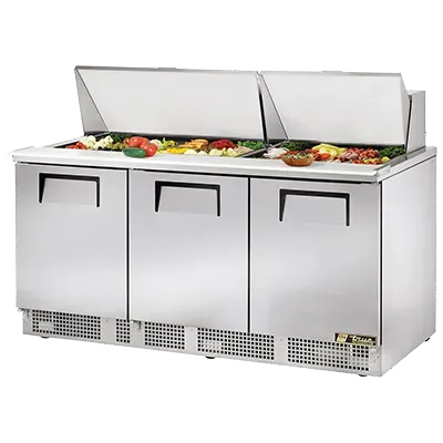 Revolutionize your cooking setup with the True Manufacturing TFP-72-30M Refrigerated Counter, Mega Top Sandwich / Salad Unit. This three-section, self-contained unit is designed to meet the demands of a busy commercial restaurant kitchen. With its spacious interior, you can easily store and organize your sandwich and salad ingredients in the (30) 1/6 size poly pans. The stainless steel insulated cover ensures that your ingredients stay fresh and at the perfect temperature. The unit also features an 8-inch thick cutting board, providing a convenient workspace for food preparation. Made in the USA, this sandwich/salad unit is built to last with its stainless steel front, top, and sides, and aluminum back. The aluminum interior with a stainless steel floor is easy to clean and maintain. With rear-mounted refrigeration and 2-1/2 inch castors, this unit is both efficient and mobile. Trust True Manufacturing to deliver high-quality, reliable equipment for your commercial kitchen.