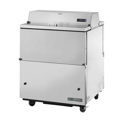 Introducing the True Manufacturing TMC-34-S-DS-SS-HC Milk Cooler / Station, designed to simplify restaurant operations. This mobile milk cooler is a must-have for any commercial restaurant looking to streamline their milk storage and dispensing process. With its forced-air cooling system, it ensures that your milk stays at the perfect temperature of 33 - 38F, keeping it fresh and ready for use. The dual-sided stainless steel drop front/hold-open flip-up lids provide easy access to the milk crates, allowing for quick and efficient restocking. The stainless steel exterior and interior, along with the stainless steel floor, make this milk cooler durable and easy to clean, ensuring optimal hygiene standards. The digital thermometer allows for precise temperature control, while the 4" castors make it easy to move around your kitchen. Made in the USA by True Manufacturing, this milk cooler is not only reliable but also energy-efficient, thanks to its R290 Hydrocarbon refrigerant. Simplify your restaurant operations with the True Manufacturing TMC-34-S-DS-SS-HC Milk Cooler / Station.