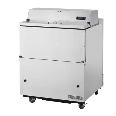 Cooking at its finest begins with the True Manufacturing TMC-34-S-HC Milk Cooler / Station. This mobile milk cooler is designed to meet the demands of a commercial restaurant, ensuring that your milk stays fresh and easily accessible. With its forced-air system and stainless steel drop front/hold-open flip-up lids, this cooler can accommodate up to 8 crates of milk, keeping them at the optimal temperature of 33 - 38F. The stainless steel exterior and aluminum interior with a stainless steel floor not only provide durability but also make cleaning a breeze. The cooler is equipped with (2) heavy-duty floor racks, allowing for efficient organization and storage. The digital thermometer ensures precise temperature control, while the 4" castors make it easy to move the cooler around your kitchen. Made in the USA and certified by cULus and UL EPH Classified, the True Manufacturing TMC-34-S-HC Milk Cooler / Station is a reliable and efficient addition to any commercial restaurant.